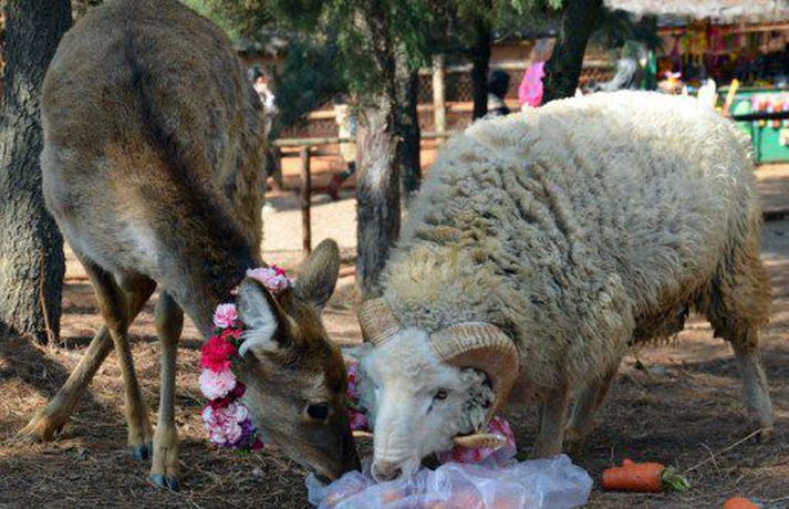 Hrútur og dádýr gengu í hjónaband 14. febrúar 2012 23:16 Changmao og Chunzi stuttu fyrir brúðkaupið. mynd/AFP Hrútur og dádýr gengu í hjónaband í dýragarði í Kína í dag. Óvanalegt ástarsamband hrútsins Changmao og dádýrsins Chunzi er víðfrægt í Kína og voru því rúmlega 500 manns viðstaddir þegar hjónabandið var innsiglað. Dýrin voru klædd viðhafnarfötum þegar þau voru gefin saman. Changmao og Chunzi hafa átt í ástarsambandi síðustu misseri en gæslumenn í dýragarðinum í Kunming borg í suðvesturhluta Kína þurftu þó að aðskilja parið á síðasta ári. „Við settum Changmao og Chunzi saman búr einfaldlega vegna þess að dýrin eru bæði jurtaætur," sagði Liu Gencheng, talsmaður dýragarðsins. Stuttu seinna tóku gæslumenn eftir því að dýrin voru ástúðleg í garð hvors annars. Chunzi sleikti háls Changmao og hann réðst á karlkyns dádýr sem nálguðust Chunzi. Changmao hefur ekki beinlínis verið trúr Chunzi og feðraði lamb með einu kvenkyns rollu dýragarðsins. Changmao var því fluttur til rollunnar og lambsins. Endurfundirnir voru þó eftirminnilegir og var ákveðið að gefa dýrin saman í dag. Mest lesið Tugir látnir eftir sprengingu í svissneskum skíðabæ Erlent Íslendingar tjá sig um skaupið: „Versta skaup ever“ eða það besta í manna minnum? Lífið Á bak við tjöldin: „Með alls konar exit plans, trúið mér“ Innlent Óttast að um fjörutíu hafi látist á skemmtistaðnum Erlent Kirkja í Amsterdam alelda Erlent Fyrsta barn ársins kom í heiminn klukkan 00:24 Innlent Vanhelgunin ýmist skemmdarverk eða persónuleg árás Innlent Fjögurra stiga skjálfti í Bárðarbungu: „Stærsti skjálftinn á árinu“ Innlent Kamilla Bretadrottning greinir frá kynferðisofbeldi Erlent Miðahafi á Íslandi vann 642 milljónir í Víkingalottói Innlent Fleiri fréttir Óttast að um fjörutíu hafi látist á skemmtistaðnum Sór embættiseiðinn á niðurlagðri neðanjarðarlestarstöð Kirkja í Amsterdam alelda Tugir látnir eftir sprengingu í svissneskum skíðabæ Kamilla Bretadrottning greinir frá kynferðisofbeldi Dótturdóttir JFK er látin Handtóku 357 meinta ISIS-liða í kjölfar mannskæðra átaka „Sannur Finni“ fær hæli í Rússlandi Sífellt fleiri hermenn falla á ári hverju Hvetur ESB til að svara refsiaðgerðunum Bandaríkjanna fullum hálsi Þrítugasta árásin á bát meintra smyglara TikTok-áskorun leiddi til banafalls af útvarpsmastri Blóðbaðið í El Fasher: Milljón manna borg orðin að „draugabæ“ Neita að ræða við Úkraínumenn vegna meintrar árásar á heimili Pútíns Sádar sprengja hergögn frá furstadæmunum í Jemen og hóta frekari árásum Á lista yfir þrjú hlýjustu ár í mælingasögunni Selenskí sver af sér drónaárás á heimili Pútíns Bandaríkin leggja til tvo milljarða dala með skilyrðum Trump hótar skelfilegum afleiðingum afvopnist Hamas ekki Neita að tjá sig um ummæli Trumps um árás í Venesúela Kim ánægður með nýjar stýriflaugar Þrír lögregluþjónar og sex ISIS-liðar fallnir eftir átök í Tyrklandi Vill lengri tryggingar og tilbúinn til að hitta Pútín Frímúrarareglan vill lögbann á nýjar lögreglureglur Milljón dalir eða meira fyrir náðun Umkringdu Taívan og æfðu lokanir hafna „Markmið mitt var bara að ná byssunni af honum“ Minnst einn látinn eftir að tvær þyrlur rákust saman í loftinu Trump telur friðarsamkomulag mögulegt innan nokkurra vikna „Þetta er ansi flókið, en þó ekki svo flókið“ Sjá meira