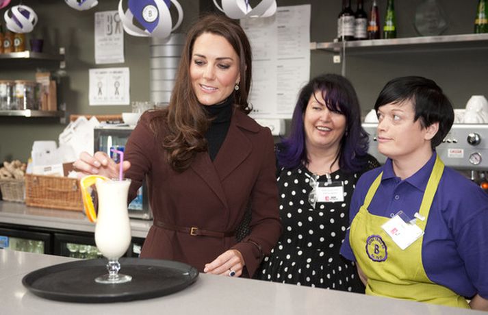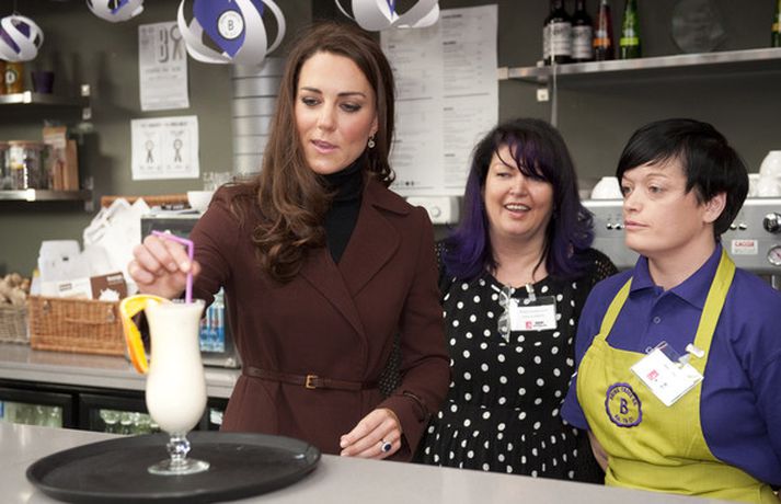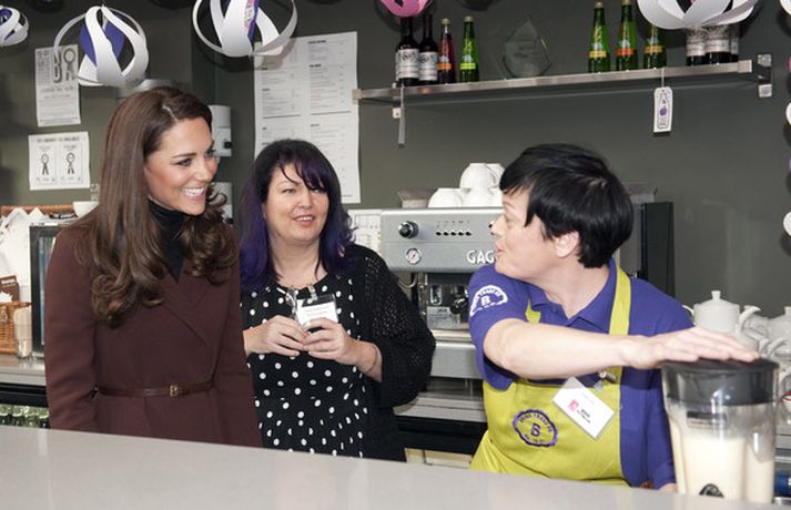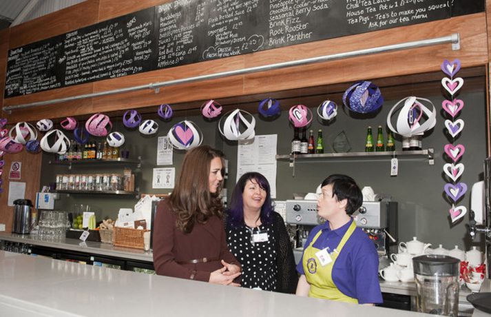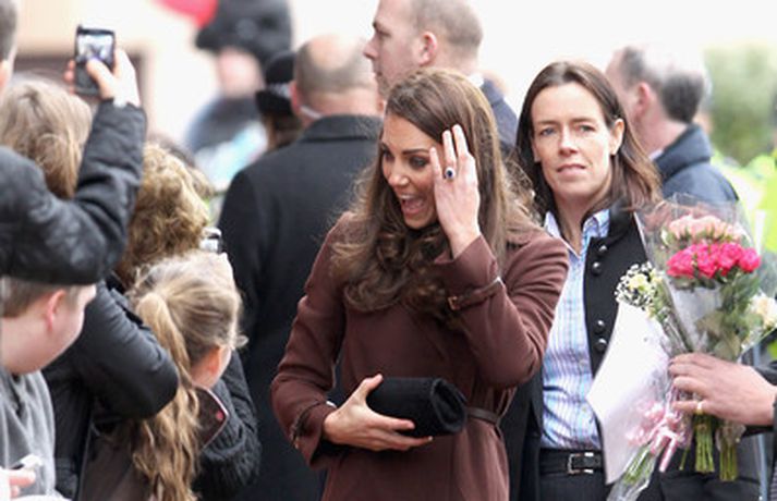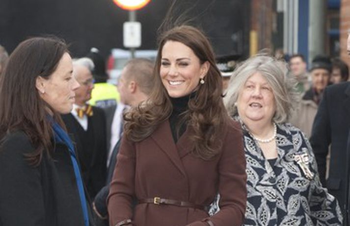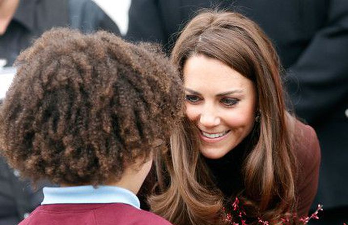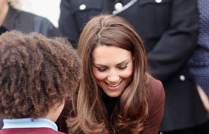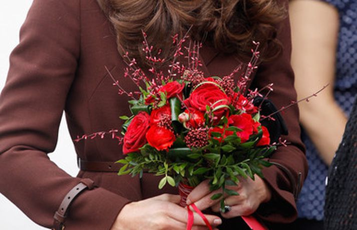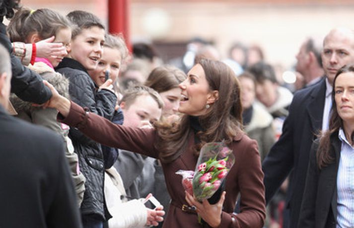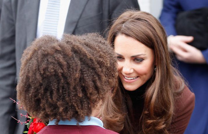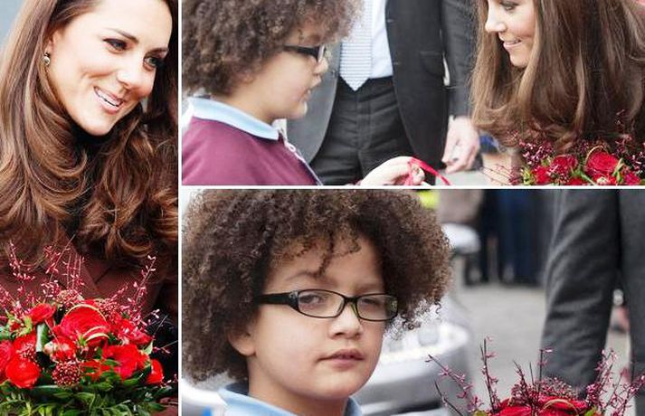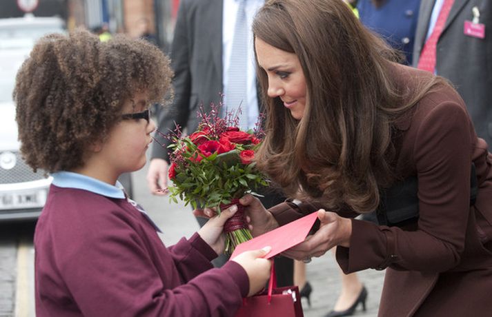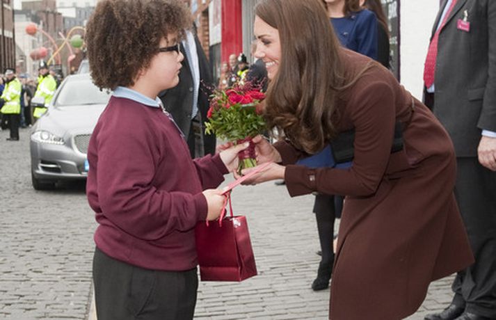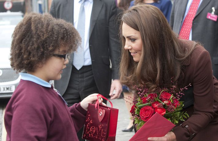 Hertogaynjan af Cambridge, Kate Middleton, eyddi ekki Valentínusardeginum með konungborna eiginmanni sínum, Vilhjálmi Bretaprins, heldur lét hún gott af sér leiða og heimsótti Liverpool í London í dag. Átta ára gamall aðdáandi, Jaqson Johnston-Lynch, færði Kate fallegan rósarvönd og bollaköku sem á stóð „Jaqson loves Kate" eða Jaqson elskar Kate. Kate hvíslaði því að drengnum þegar hún tók við gjöfinni að Vilhjálmur sendi henni blómvönd og rómantískt kort með fallegri ástarkveðju í morgun. Eins og sjá má í myndasafni var Kate snortin yfir Valentínusarglaðningnum.myndir/cover media