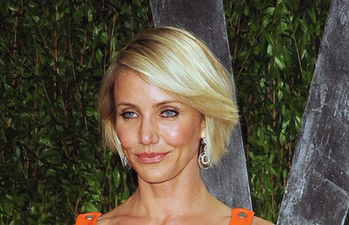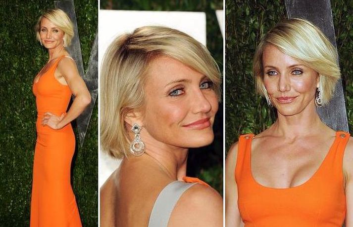 Leikkonan Cameron Diaz, 39 ára, var klædd í appelsínugulan síðkjól eftir Victoriu Beckham í Vanity Fair teitinu sem haldið var eftir Óskarinn í gærkvöldi. Eins og sjá má var kjóllinn eins og sniðinn á leikkonuna. Fyrr sama kvöld var hún klædd í ljósan Gucci kjól þegar hún kynnti besta förðunarfræðing og fatahönnuð ársins ásamt Jennifer Lopez. Cameron var með skartgripi frá David Webb.