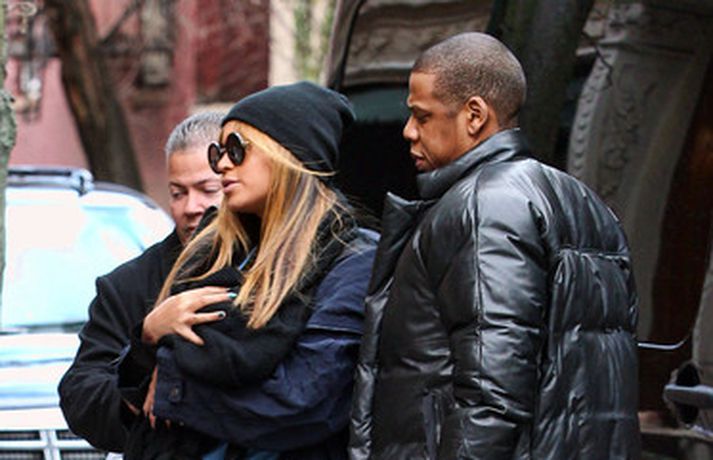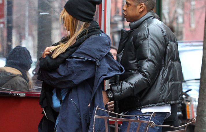 Beyonce Knowles og eiginmaður hennar, Jay-Z lyftu sér upp á dögunum er þau fórum með nokkra vikna dóttur sína í hádegisverð með vinum í New York. Beyonce hélt þéttingsfast utan um Blue Ivy sem hún bar utan á sér í magapoka.
