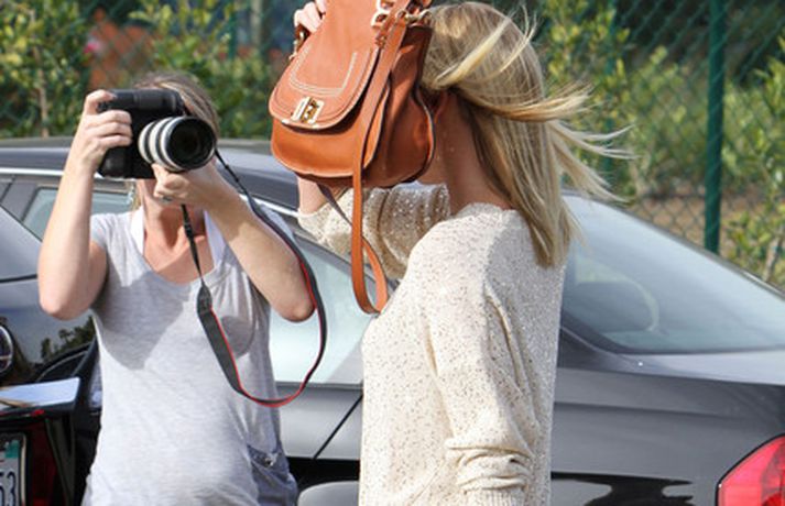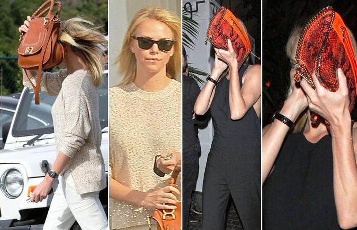 Leikkonan Charlize Theron, 36 ára, er greinilega búin að fá sig fullsadda af ljósmyndurum sem elta hana hvert fótspor sem hún tekur. Eins og sjá má á meðfylgjandi myndum sem teknar voru af leikkonunni yfirgefa snyrtistofu í Beverly Hills í gær notaði hún brúnu Chloe handtöskuna sína til að hlífa andlitinu fyrir æstum paparössum og appelsínugula veskið sitt þegar hún yfirgaf Chateau Marmont veitingastaðinn í Los Angeles síðar sama dag.