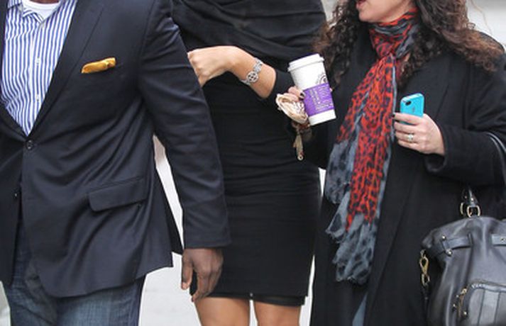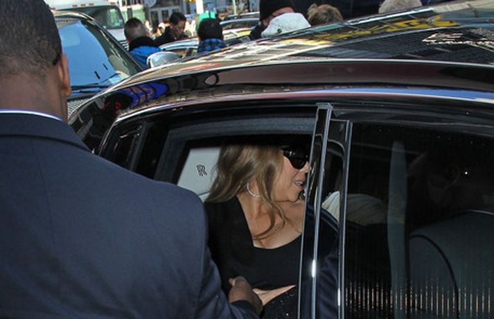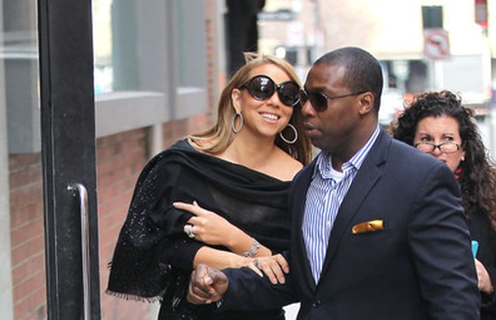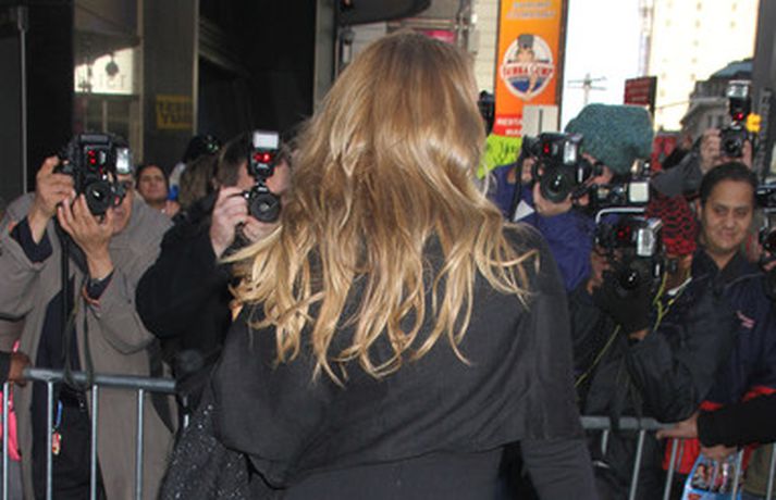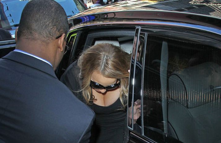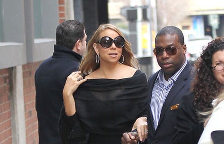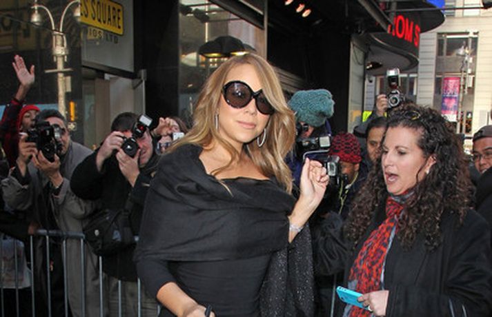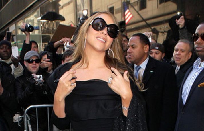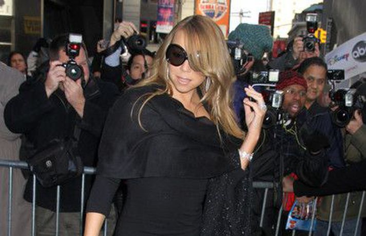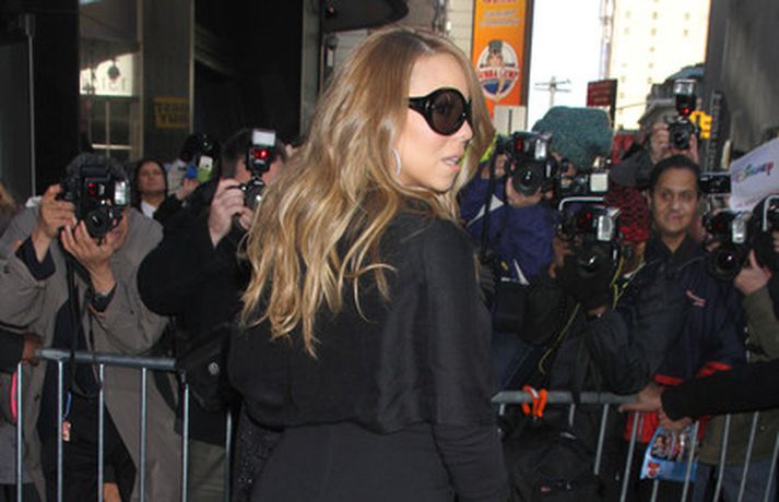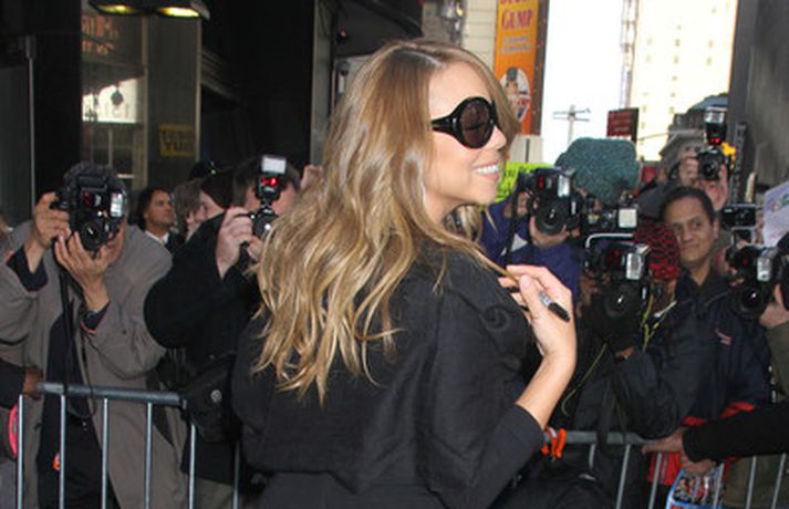 Söngkonan Mariah Carey, 41 árs, átti ekki í vandræðum með að stilla sér upp fyrir fjölda ljósmyndara fyrir utan ABC upptökuverið á á Time Square í New York í gær. Mariah pósaði eftir að hún var gestur í sjónvarpsþættinum Good Morning America þar sem hún ræddi væntanlega plötu sem hún vinnur að um þessar mundir og hvernig hún fór að því að komast í kjörþyngd eftir að hún fæddi tvíburana. Eins og sjá má var Mariah klædd í svartan kjól með stærðarinnar sólgleraugu á nefinu sem fóru henni þetta líka svona vel.