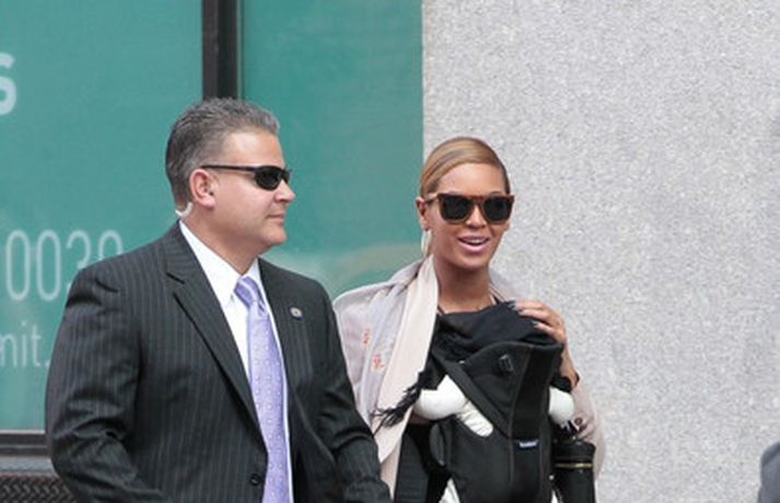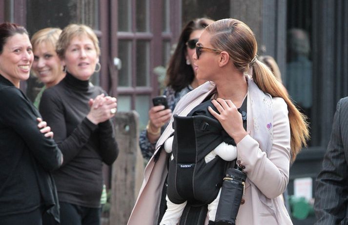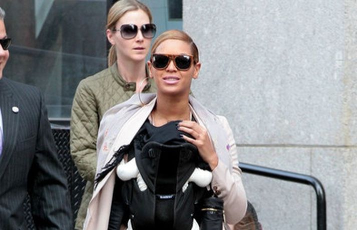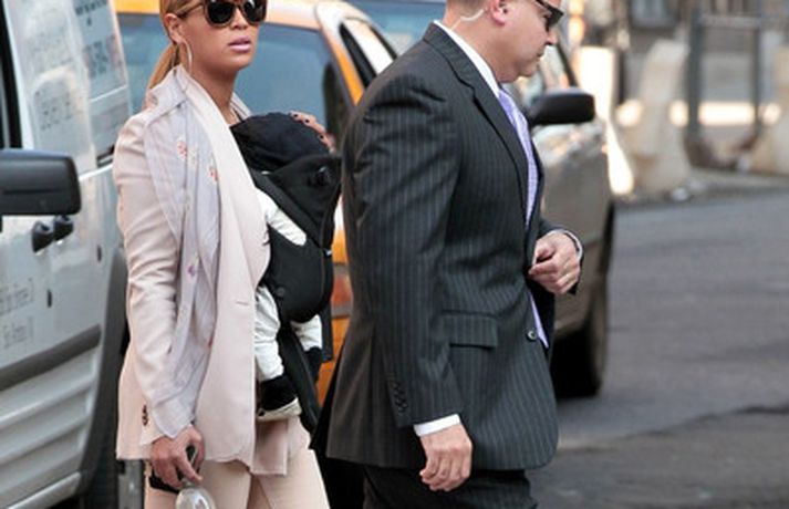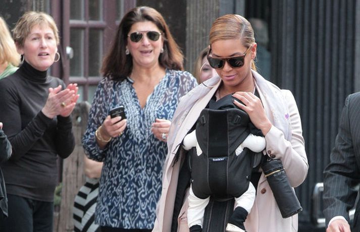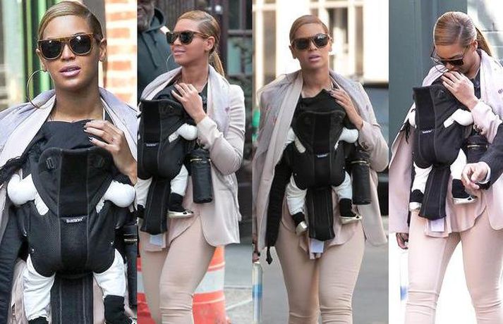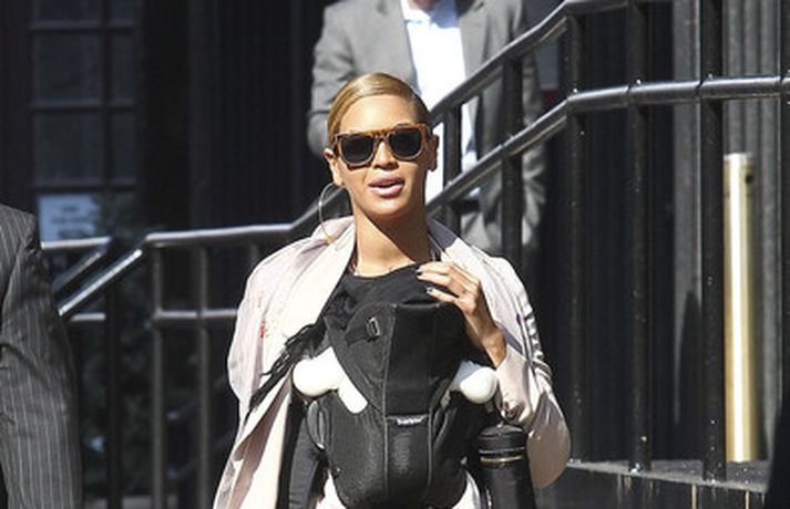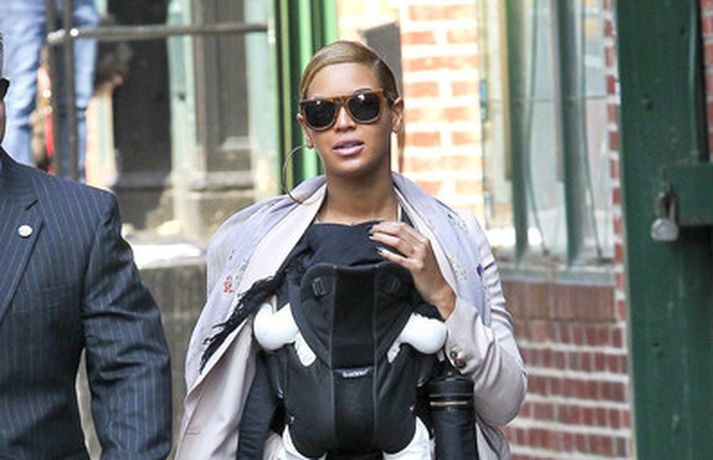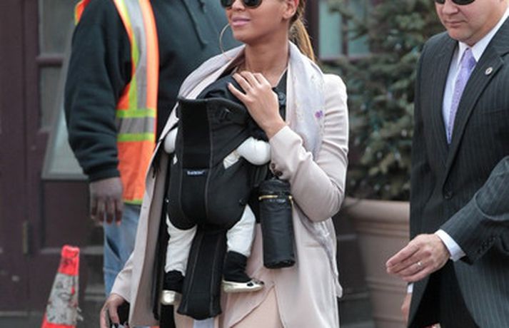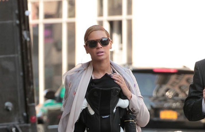 Söngkonan Beyonce Knowles, 30 ára, gekk um götur New York borgar í gær með dóttur sína, Blue Ivy , framan á sér í barnapoka. Eins og sjá má á myndunum vöktu mæðgurnar athygli vegfarenda en þær voru í fylgd lífvarðar sem passaði upp á þær. Eiginmaður og barnsfaðir Beyonce, rapparinn Jay-Z, 42 ára, var fjarri góðu gamni.