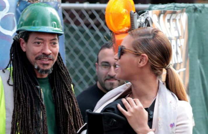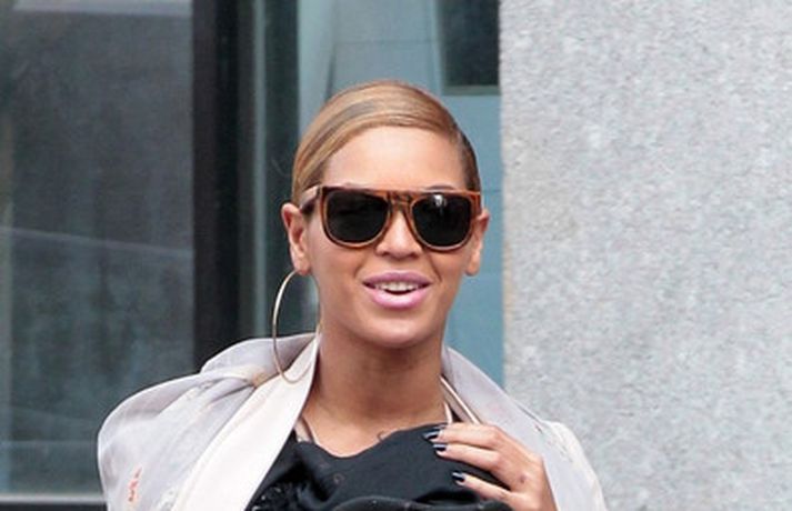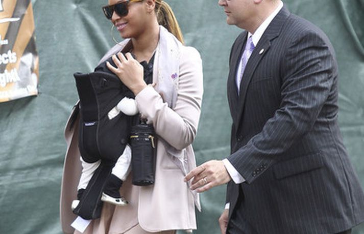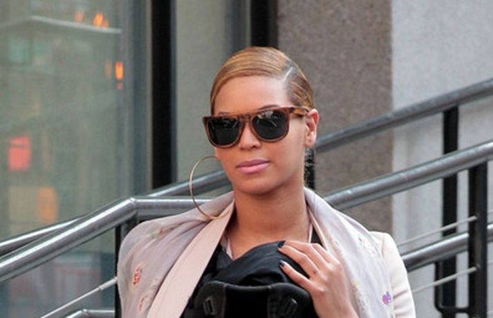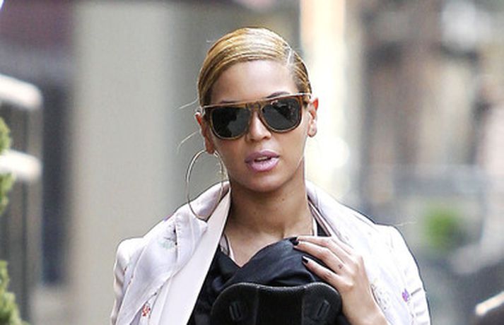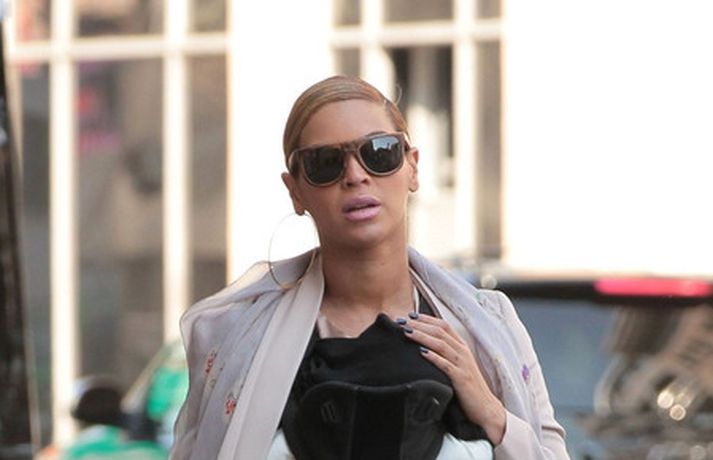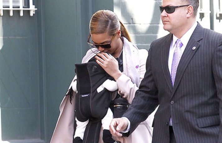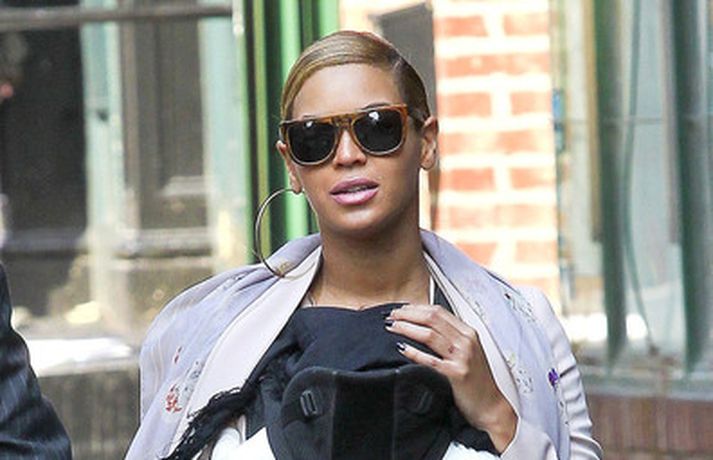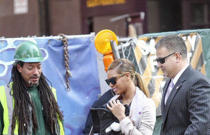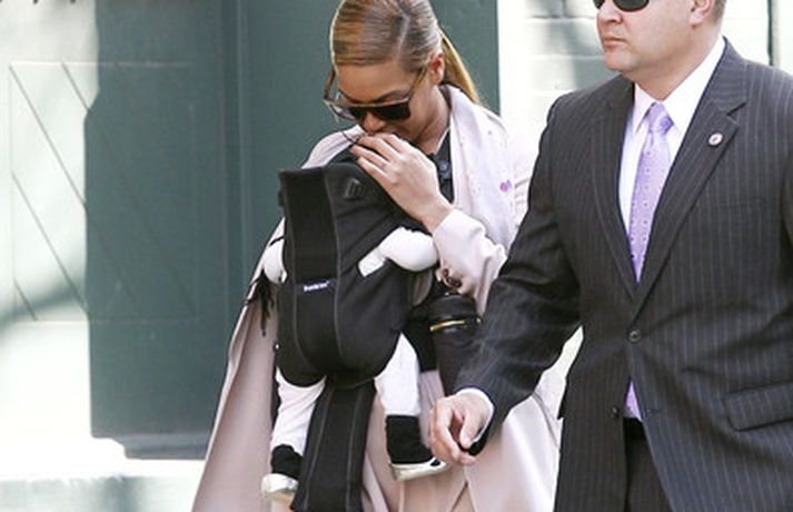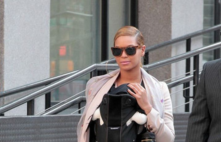 Söngkonan Beyonce Knowles, 30 ára, gekk um götur New York borgar í gær með dóttur sína, Blue Ivy , framan á sér í barnapoka. Eins og sjá má á myndunum vöktu mæðgurnar athygli vegfarenda en þær voru í fylgd lífvarðar sem passaði upp á þær. Eiginmaður og barnsfaðir Beyonce, rapparinn Jay-Z, 42 ára, var fjarri góðu gamni.