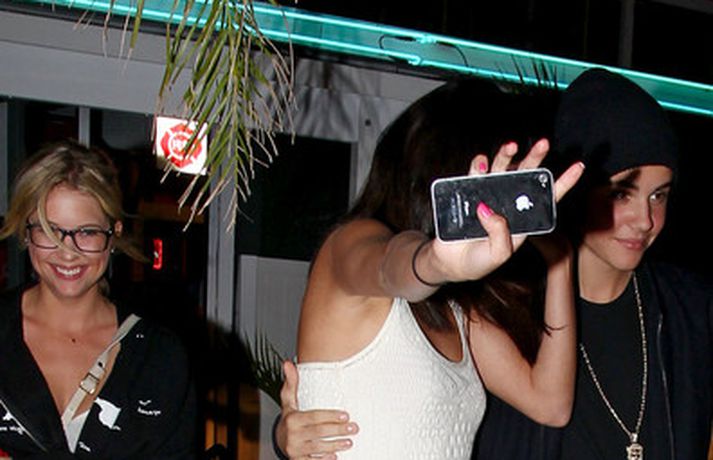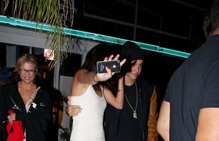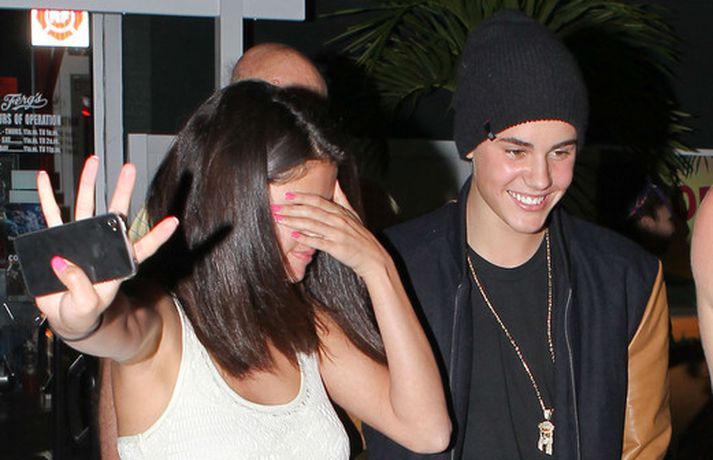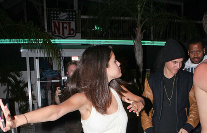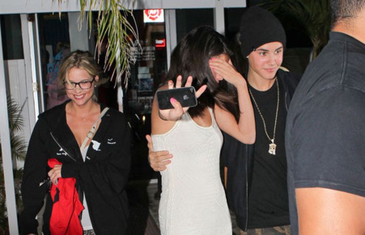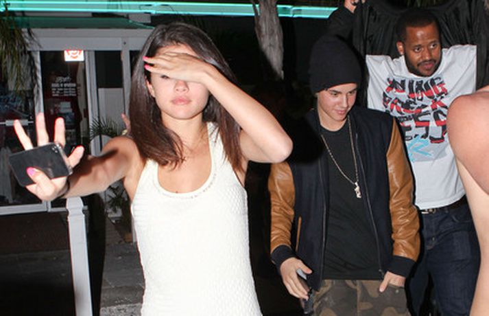 Justin Bieber og unnusta hans, Selena Gomez, 19 ára, reyndu allt hvað þau gátu til að forðast ágenga ljósmyndara þegar þau yfirgáfu bar í Florida um helgina. Justin, sem varð átján ára 1. mars, fékk eftirfarandi afmlæiskveðju frá Selenu á Twitter: „Til hamingju með afmælið besti vinur í heimi!!! Vonandi verður afmælisdagurinn frábær elskan!" Eins og sjá má í myndasafni reyndi Selena að hylgja andlit sitt með símanum sínum.