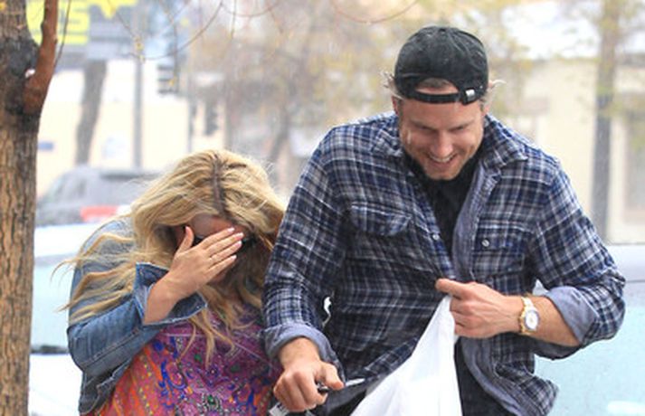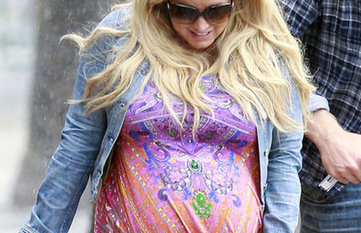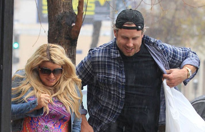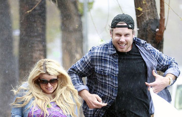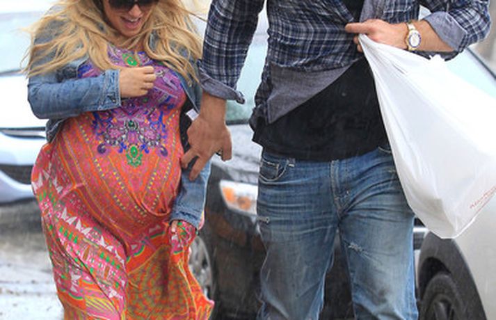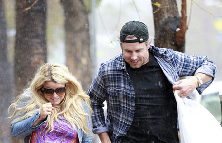 Söngkonan Jessica Simpson, 31 árs, gekk hröðum skrefum í rigningunni í ásamt unnustanum Eric Johnson í Los Angeles í gær, sunnudag. Eins og sjá má á myndunum er Jessica blómleg en hún var klædd í síðan fallega munstraðan kjól.