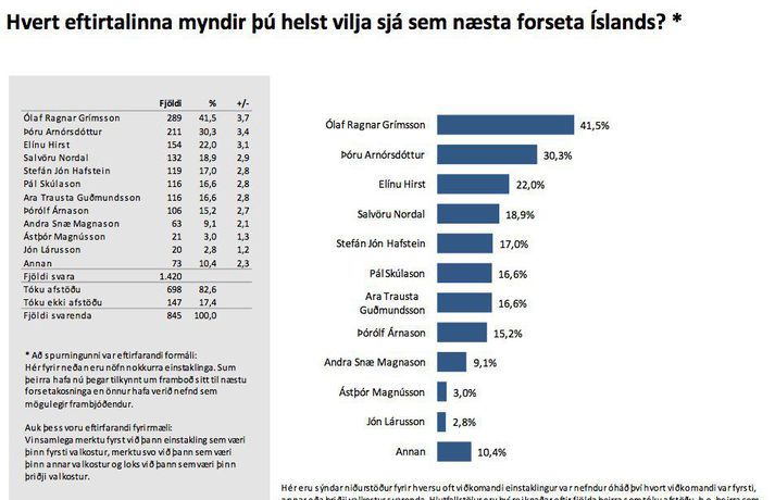 Tveir af hverjum þremur vilja nýjan forseta á Bessastaði, eða rúm 66 prósent landsmanna. Þetta er niðurstaða nýrrar könnunar Capacent Gallup. Tæplega 34 prósent þeirra sem tóku afstöðu í könnunni vildu helst sjá Ólaf Ragnar Grímsson gegna embætti forseta Íslands áfram. Í tilkynningu frá hópnum Betri valkost á Bessastaði, sem lét framkvæmda könnunina, segir að þrjár konur hafi oftast verið nefndar sem þeir valkostir sem fólk vildi helst fá í staðinn fyrir sitjandi forseta. „Þetta eru þær Þóra Arnórsdóttir, Elín Hirst og Salvör Nordal. Næstir á eftir komu Páll Skúlason, Stefán Jón Hafstein og Þórólfur Árnason. Athygli vekur að nær tvöfalt fleiri nefndu Þóru sem sitt fyrsta val, en þau sem koma í næstu sætum á eftir." Alls völdu 30,3% þeirra sem nefndu að minnsta kosti einn valkost í könnuninni Þóru sem sitt fyrsta, annað eða þriðja val, en 41,5% þeirra völdu Ólaf í eitthvað sæti. Þá völdu rúmlega 22% Elínu Hirst og tæplega 19% Salvöru Nordal sem sitt fyrsta til þriðja val. Aðrir sem spurt var um i könnuninni voru valdir í eitthvað sæti af um 17% eða færri. „Samkvæmt þessu virðist fjöldi frambjóðenda geta ráðið mestu um það hvort núverandi forseti haldi velli eða ekki. Þá vekur það athygli að 83% af þeim sem svöruðu tóku afstöðu," segir í tilkynningunni. Þátttakendur í könnuninni voru beðnir um að velja sinn fyrsta, annan og þriðja valkost sem næsta forseta landsins. Könnunin fór fram dagana 15. - 23. mars 2012. Spurt var: Hvert eftirtalinna myndir þú helst vilja sjá sem forseta Íslands? Svarhlutfall var 62,8% og úrtaksstærð 1346 einstaklingar af öllu landinu, 18 ára og eldri, valdir handahófskennt úr viðhorfshópi Capacent Gallup. Könnunin var gerð fyrir hópinn Betri valkost á Bessastaði, sem stofnaður var fyrr í þessum mánuði.