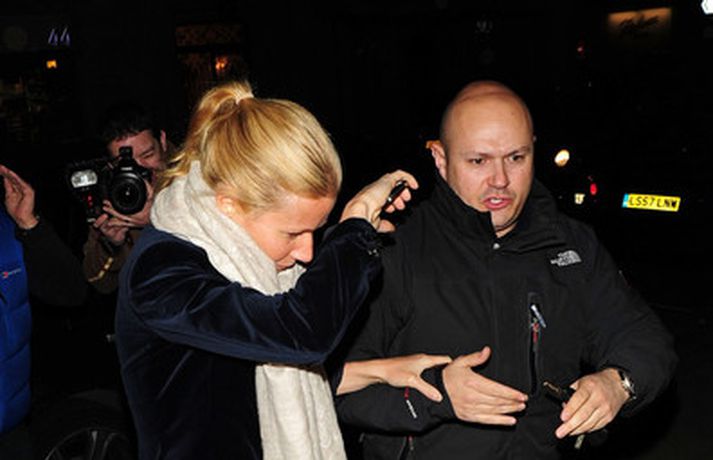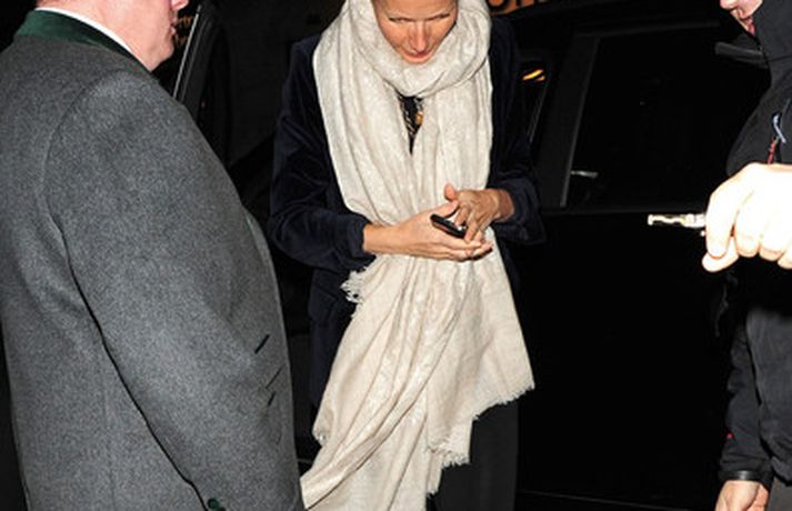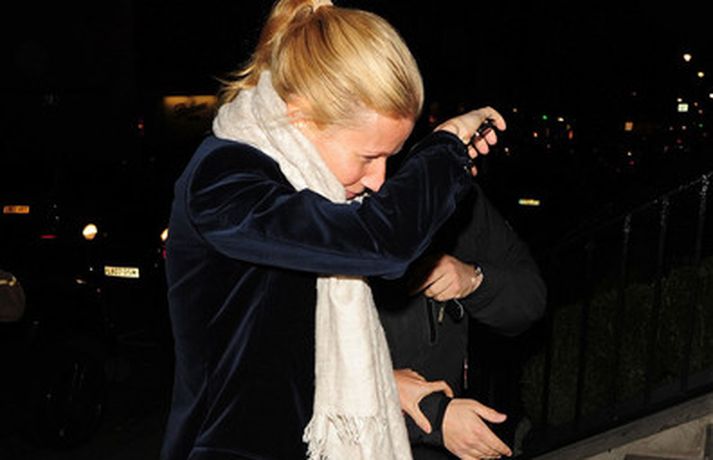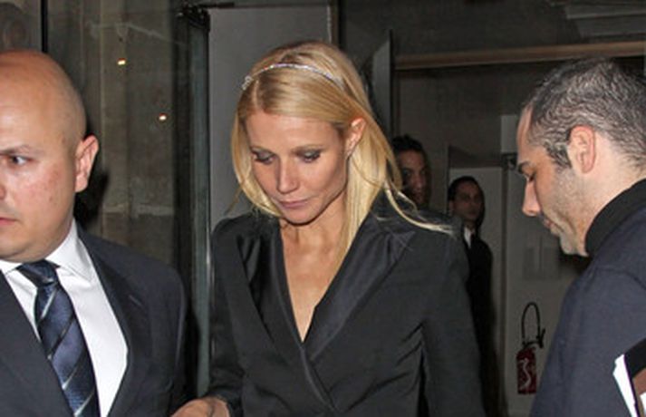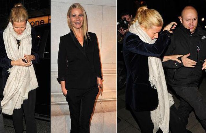 Leikkonan Gwyneth Paltrow, 39 ára, var klædd í svarta stórglæsilega Louis Vuitton dragt í teiti á vegum hönnuðarins Marc Jacobs á tískuvikunni í París á dögunum. Þá var Gwyneth mynduð í gær fyrir utan veitingahús í Lundúnum. Eins og sjá má í myndasafni reyndi hún allt hvað hún gat til að koma í veg fyrir að vera mynduð.