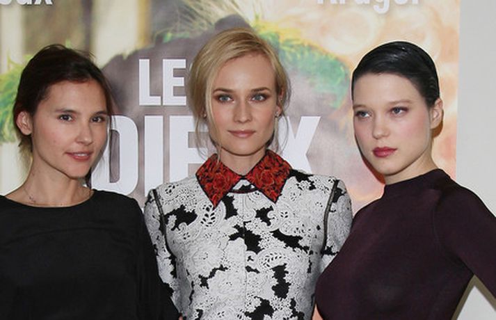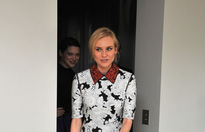 Leikkonan Diane Kruger, 35 ára, hefur verið á ferðinni í Frakklandi þar sem hún kynnir nýju kvikmyndina „Farewell, My Queen“. Diane var vægast sagt stórglæsileg klædd í svarta útsaumaða Jason Wu yfirhöfn með bera leggi og hárið tekið aftur í snúð. Þá má sjá leikkonuna í Derek Lam hvít-mynstruðum kjól með rauðum kraga.