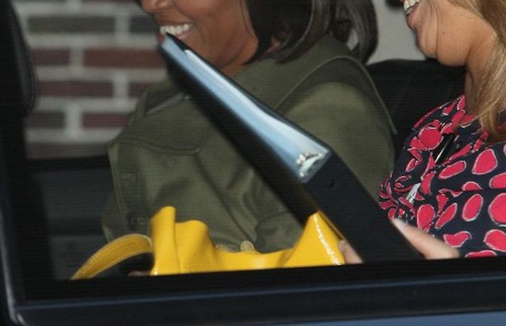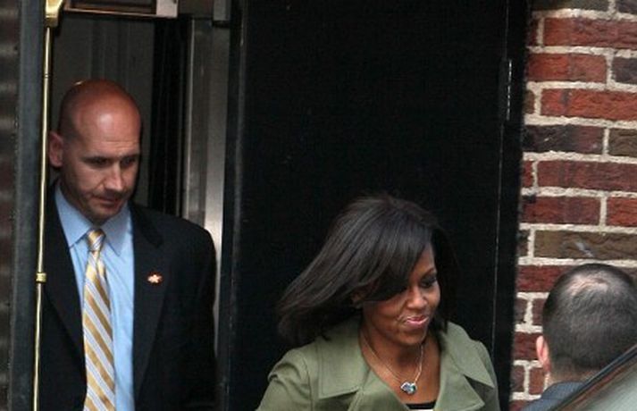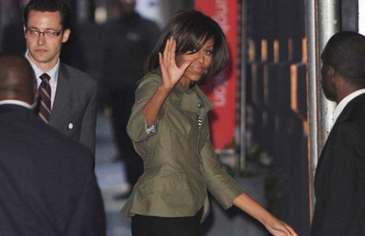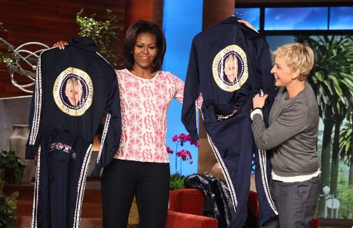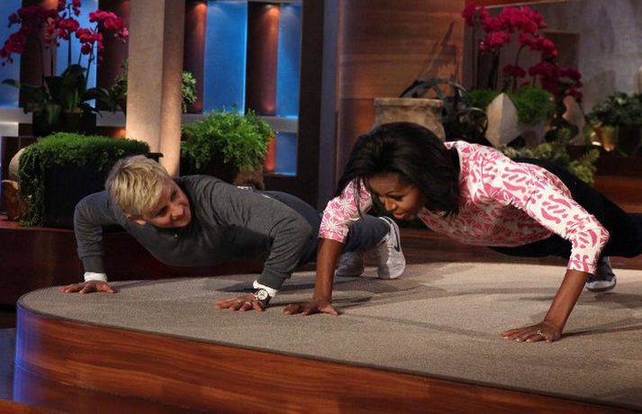 Forsetafrúin Michelle Obama, 48 ára, mætti í sjónvarpsþátt David Letterman á mánudaginn var. Þá mætti hún einnig í þátt Ellenar DeGeners þar sem Ellen spurði hana hvort hún tíndi upp skítuga sokka af eiginmanninum. "Nei, nei. Hann tínir þá sjálfur upp. Hann heldur því fram að hann sé duglegur að taka til en ég minni hann á að það er fólk sem aðstoðar hann við þetta. Það er hreinlega fólkið," sagði Michelle. Þá má sjá hana taka nokkrar armbeygjur með Ellen.