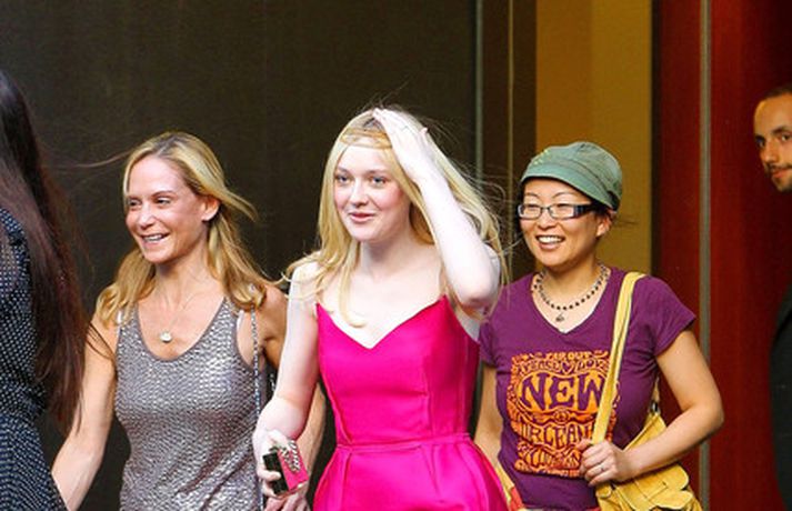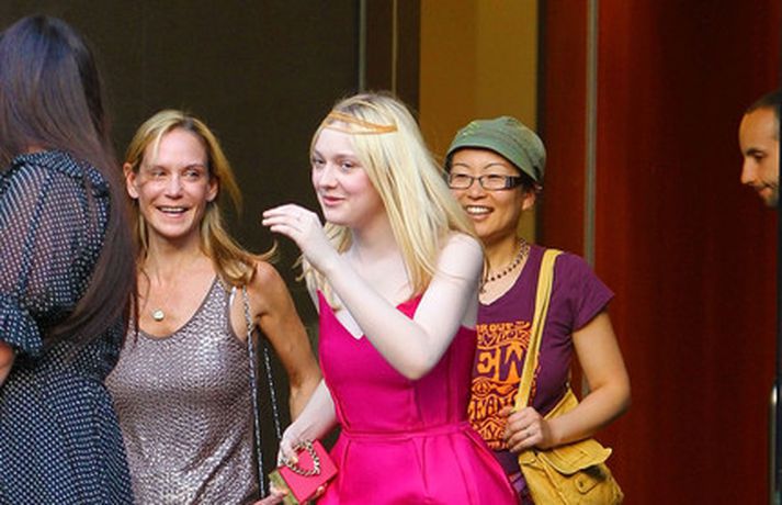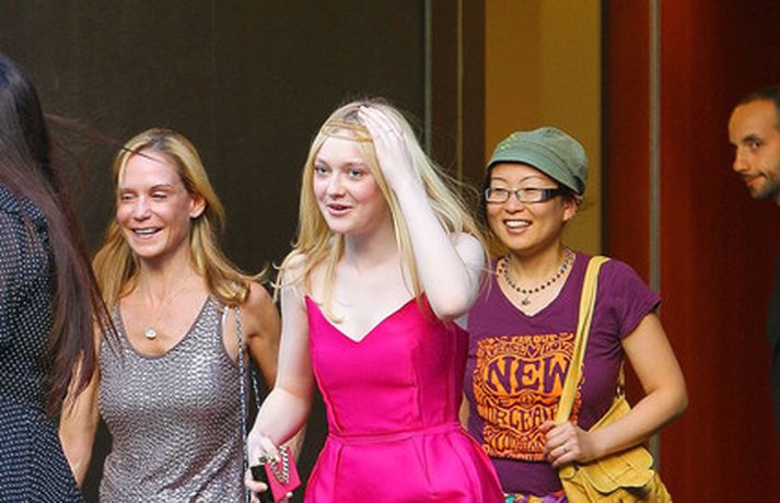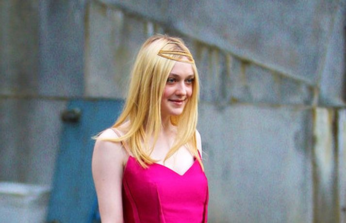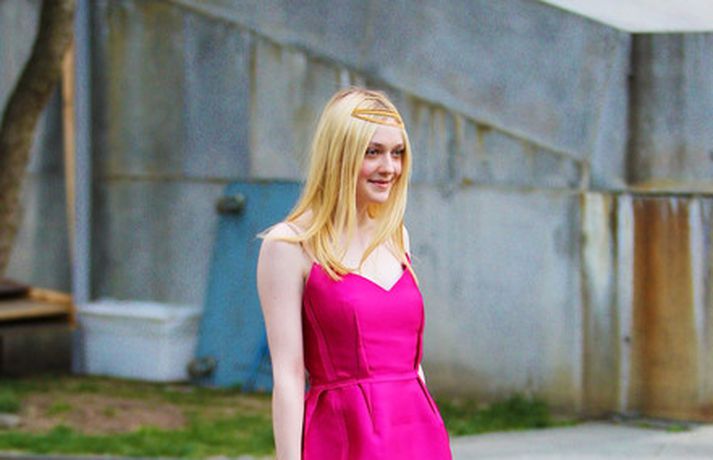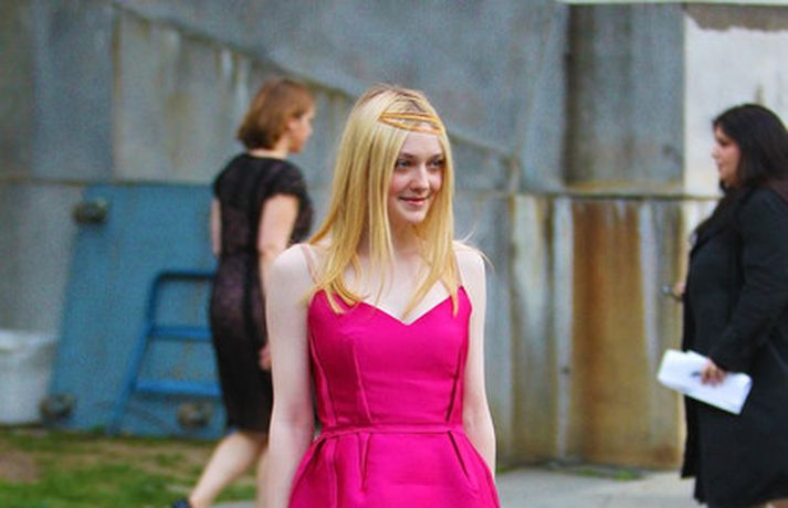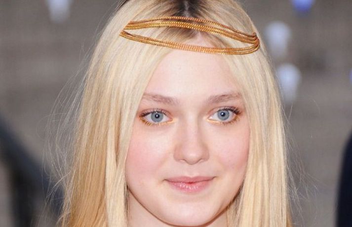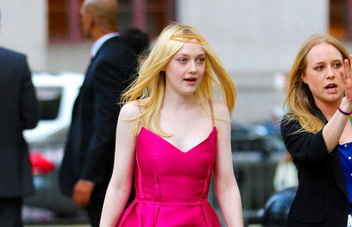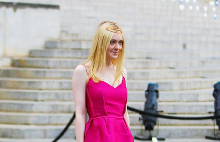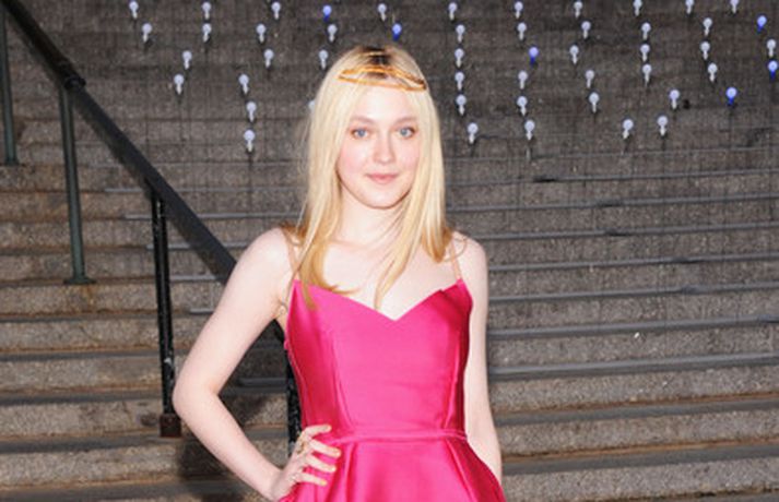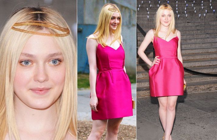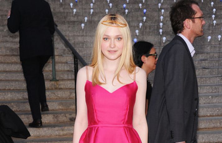 Leikonan Dakota Fanning, 18 ára, stillti sér upp í bleikum kjól í teiti í gær þar sem Tribeca kvikmyndahátíðinni var fagnað á vegum Vanity Fair tímaritsins í New York. Hún var glæsileg en það sem vakti athygli var látlaust gyllt hárskraut leikkonunnar. Skoða má hárskrautið betur í myndasafni.