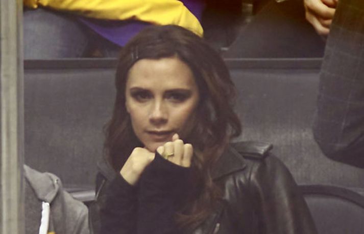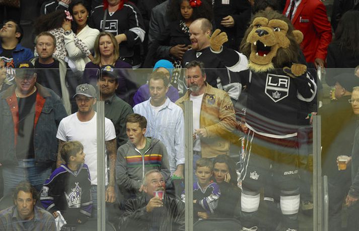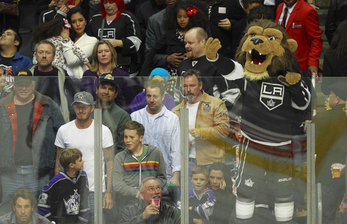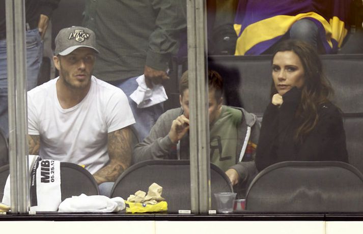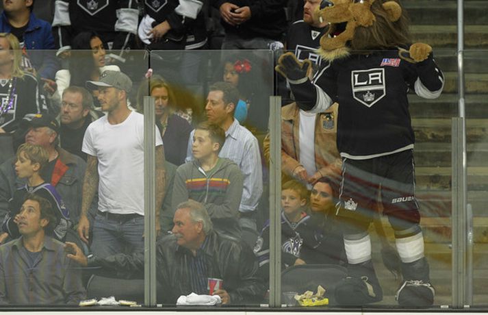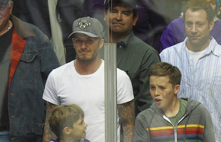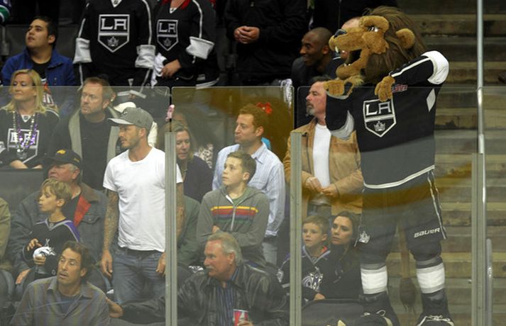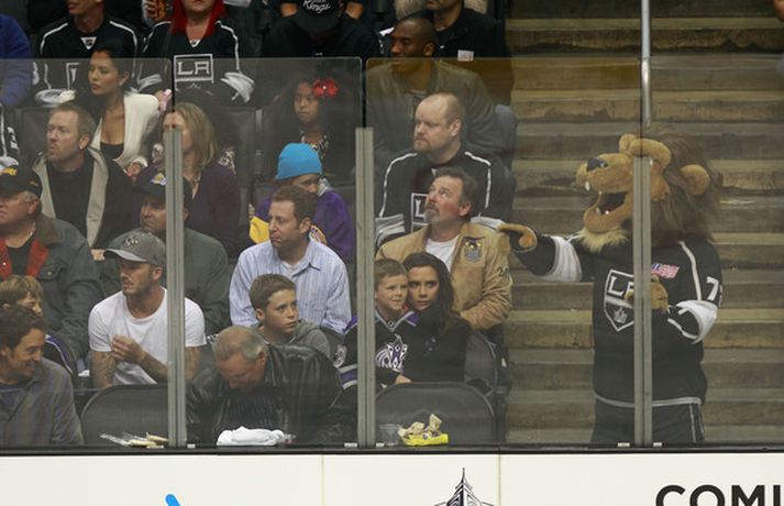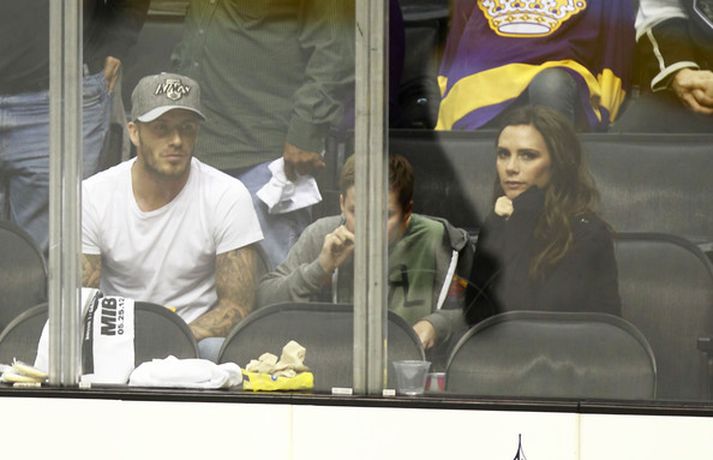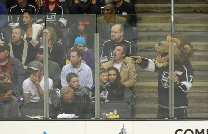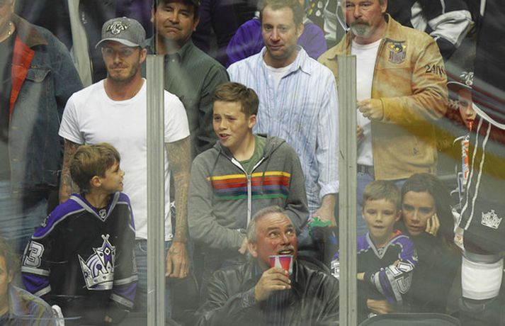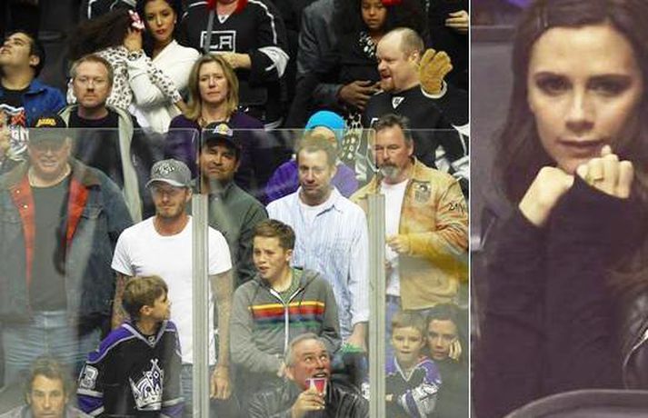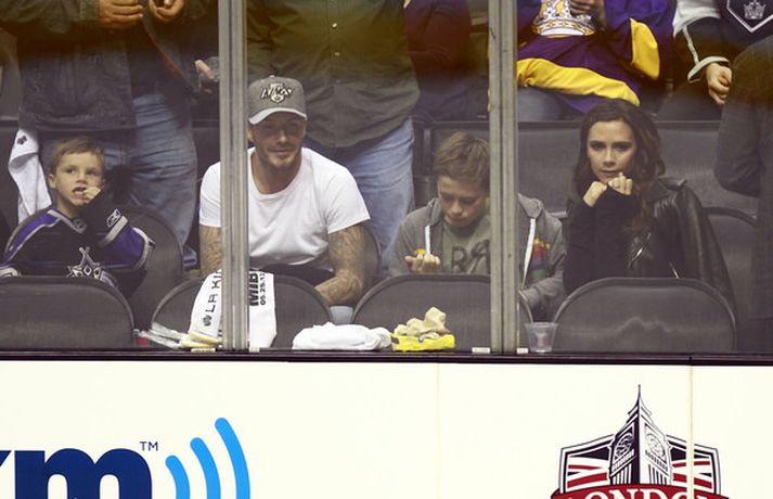 Fótboltakappinn David Beckham og eiginkona hans Victoria mættu á leik Los Angeles Kings og Vancouver Canucks ásamt drengjunum þeirra Brooklyn, Romeo og Cruz. Victoria var svartklædd með spennur í hárinu eins og sjá má á myndunum. Dóttir þeirra, Harper, var fjarri góðu gamni en greinilegt að fjölskyldan skemmti sér vel.