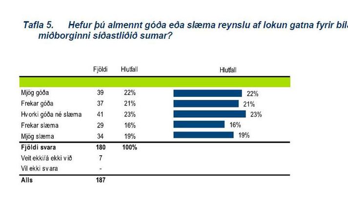 Fjörutíu og þrjú prósent rekstraraðila í miðborginni segjast hafa mjög góða eða frekar góða reynslu af lokun gatna í miðborginni fyrir bílaumferð síðastliðið sumar. Þetta kemur fram í nýrri könnun sem samtökin Miðborgin okkar létu Félagsvísindastofnun til þess að gera. Þrjátíu og fimm prósent aðspurðra sögðust hinsvegar hafa frekar slæma eða mjög slæma reynslu af lokunum. Tuttugu og þrjú prósent sögðust síðan hvorki hafa góða né slæma reynslu af tilrauninni en til stendur að endurtaka hana í sumar og loka Laugavegi fyrir bílaumferð að hluta í sumar. Þegar spurt var hvort menn væru fylgjandi eða andvígir því að loka götum í sumar þar sem þeir sjálfir eru með rekstur svöruðu 31 prósent þeirra á þann veg að þeir séu mjög andvígir því. Tuttugu og níu prósent voru hinsvegar mjög fylgjandi því, tuttugu prósent frekar fylgjandi og níu prósent frekar andvíg. Ellefu prósent höfðu ekki skoðun á málinu.