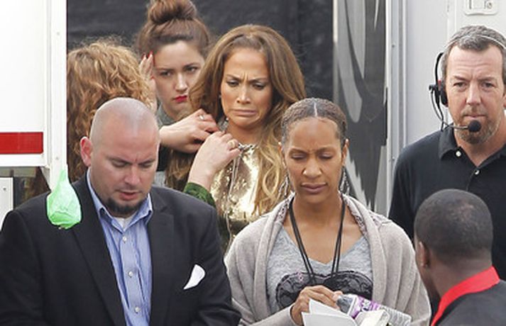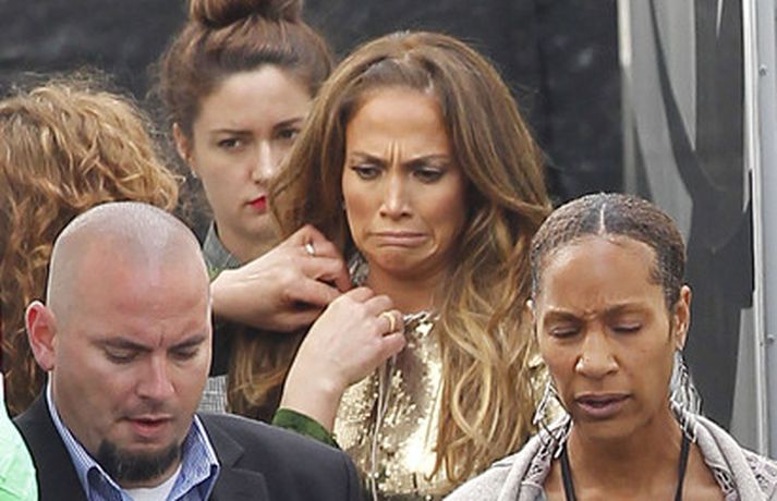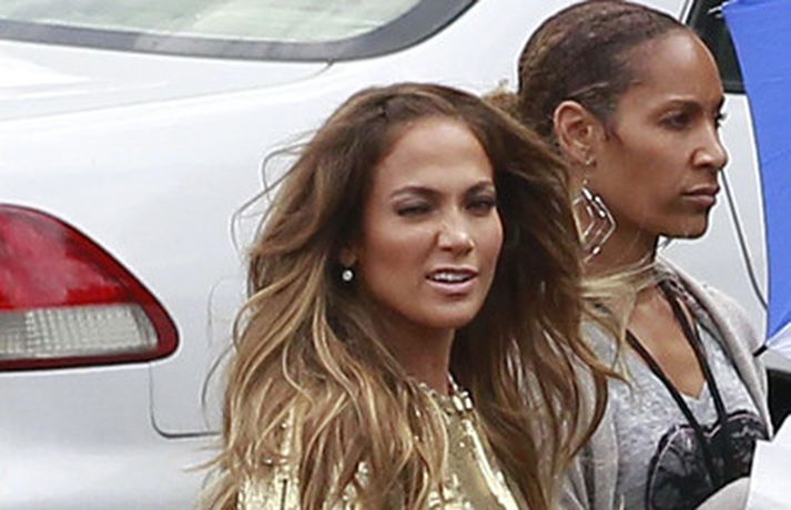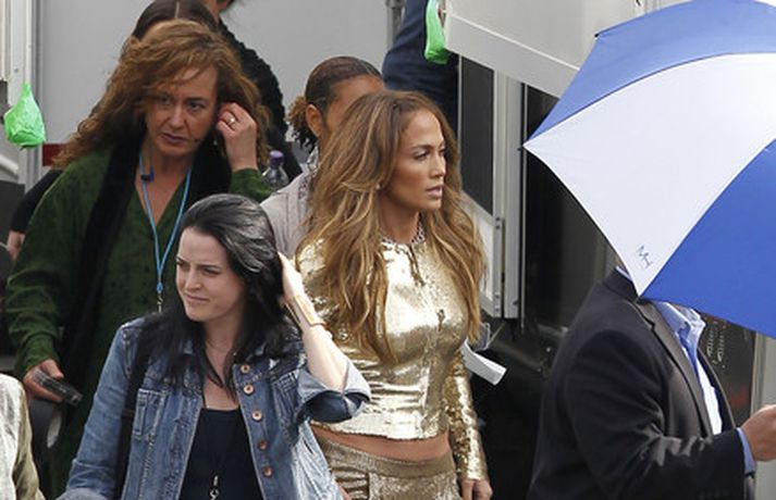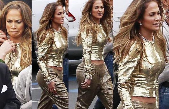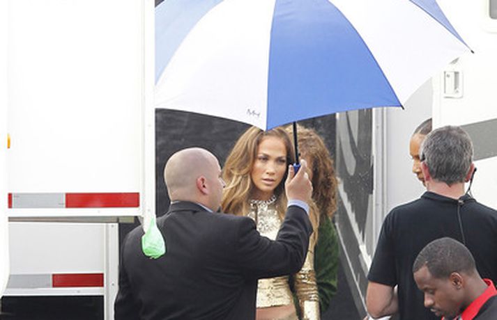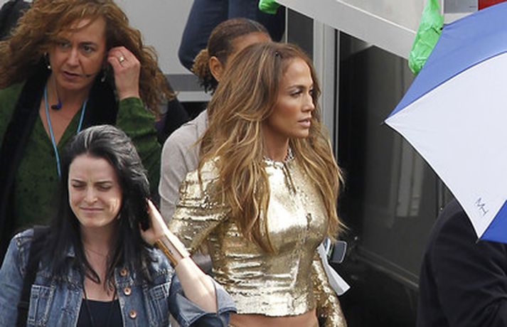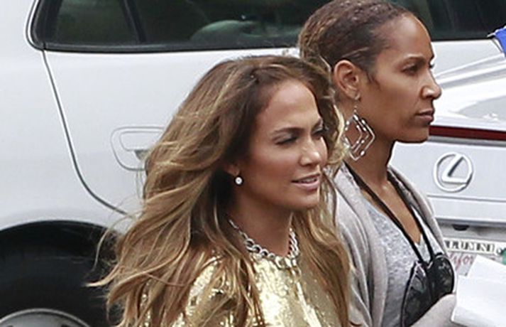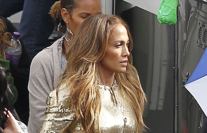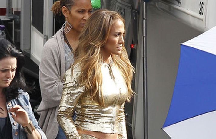 Söng- og leikkonan Jennifer Lopez var mynduð á tökustað American Idol í gær. Jennifer var glæsileg eins og ávallt klædd í gylltan topp og buxur og skó í sama lit. Dómararnir Randy Jackson og Steven Tyler voru einnig á staðnum eins og sjá má í myndasafni.