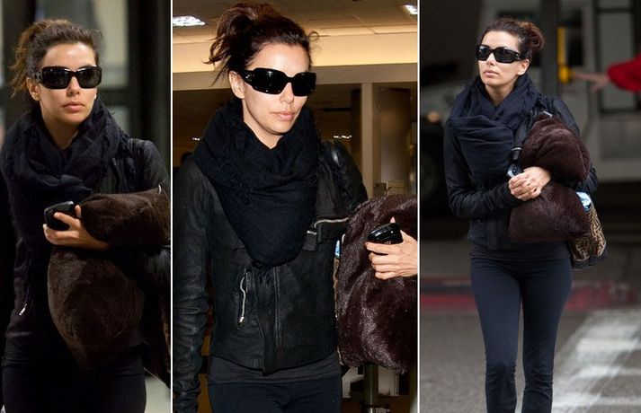 Leikkonan Eva Longoria, 37 ára, var mynduð með koddann sinn undir hendinni þegar hún mætti snemma morguns um helgina á LAX flugvöllinn í Los Angeles. Eins og sjá má í myndasafni var Eva svartklædd frá toppi til táa með sólgleraugu á nefinu og hárið tekið aftur í tagl.