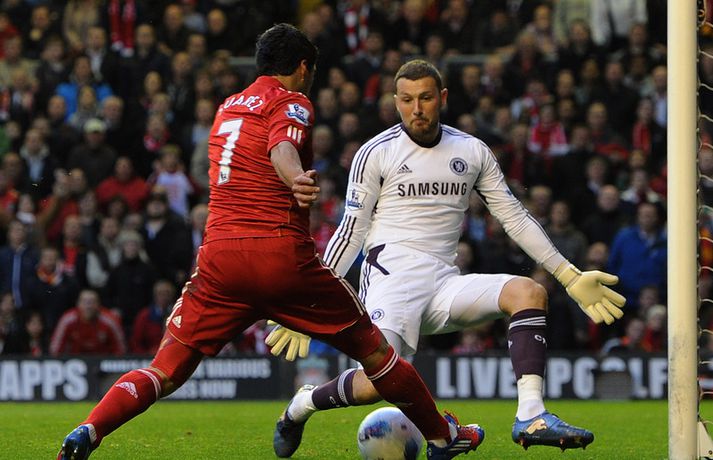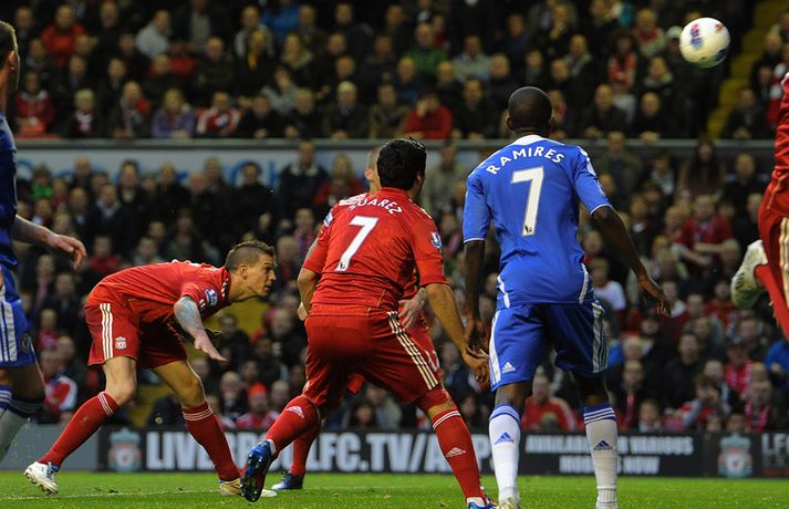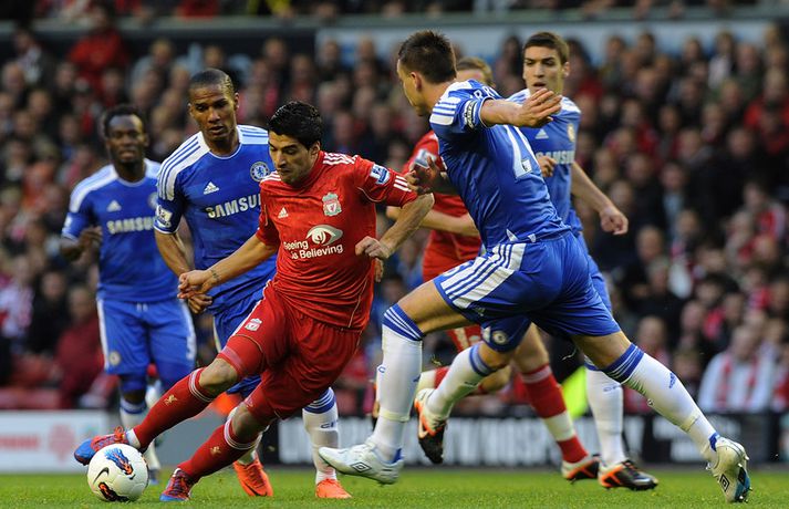 Liverpool tók nýkrýnda bikarmeistara Chelsea í kennslustund Óskar Ófeigur Jónsson skrifar 8. maí 2012 18:15 Mynd/Nordic Photos/Getty Liverpool hefndi fyrir tapið á móti Chelsea í bikarúrslitaleiknum á Wembley á laugardaginn með því að rúlla yfir nýkrýnda bikarmeistara á Anfield í kvöld. Liverpool vann leikinn 4-1 og er nú aðeins einu stigi á eftir nágrönnunum í Everton fyrir lokaumferðina. Liverpool skoraði þrjú mörk á átta mínútna kafla í fyrri hálfleik og gat líka leyft sér að klikka á vítaspyrnu í uppbótartíma fyrri hálfleiks. Liverpool nýtti sér vel að Roberto di Matteo, stjóri Chelsea, stillti upp hálfgerðu varaliði í leiknum og John Terry, fyrirliði Chelsea, átti einn sinn versta leik í manna minnum. Það voru aðeins þrír leikmenn Chelsea sem héldu sæti sínu í byrjunarliðinu frá því í bikarúrslitaleiknum á laugardaginn; John Terry, Branislav Ivanovic og Ramires. Þeir eiga það allir sameiginlegt að vera í leikbanni í úrslitaleik Meistaradeildarinnar. Liverpool gerði fjórar breytingar og Andy Carroll kom meðal annars inn í liðið en Steven Gerrard var aftur á móti ekki í hóp. Ross Turnbull var í marki Chelsea í fyrsta sinn í deildarleik í tvö ár, Ashley Cole, Frank Lampard og Juan Mata byrjuðu allir á bekknum en Didier Drogba var ekki í hóp. Luis Suarez átti fyrsta markið sem kom á 20. mínútu. Hann klobbaði þá John Terry, fyrirliða Chelsea, í annað skiptið á stuttum tíma og komst upp á endamörkum. Suarez gaf boltann fyrir og Michael Essien sendi boltann í eigið mark. John Terry gerði önnur mistök í öðru markinu sem kom fimm mínútum síðar. Terry rann þá á hausinn og Jordan Henderson komst einn í gegn og skoraði. Daniel Agger skoraði síðan þriðja mark Liverpool á aðeins átta mínútum þegar hann skallaði inn skallasendingu Andy Carroll eftir hornspyrnu frá Jonjo Shelvey. Andy Carroll fékk síðan víti í uppbótartíma fyrri hálfleiks en Stewart Downing skaut í stöngina og hefur því enn ekki náð að opna markareikning sinn hjá Liverpool í ensku úrvalsdeildinni. Ramires minnkaði muninn í 3-1 á 50. mínútu þegar hann fékk aukaspyrnu Florent Malouda í sig. Jonjo Shelvey bætti hinsvegar við fjórða marki Liverpool á 61. mínútu með laglegu langskoti eftir misheppnað útspark Ross Turnbull. Liverpool fékk fullt af færum til að bæta við mörkum í seinni hálfleiknum en Chelsea slapp með 4-1 tap. Mest lesið „Í dag er dagurinn sem þú fæddist, í dag er dagurinn sem þú munt deyja“ Enski boltinn Mætti til leiks berfættur og ber að ofan í snjókomunni Sport „Sé ekkert annað en að dýrasti leikmaður deildarinnar verði áfram á bekknum“ Enski boltinn Ballið búið hjá Chiefs og Mahomes meiddist á hné Sport Þórir í skýjunum: „Sit með lítið tár í augnkróknum“ Handbolti „Troðslan sem þið sjáið núna verður ekki toppuð“ Körfubolti Körfuboltakvöld: Tilþrif tímabilsins til þessa Körfubolti Keyptu nýjan leikvang fyrir Glódísi og Bayern-konurnar Fótbolti Pogba dreymir um að eiga dýrasta úlfalda heims Sport Emelía valin efnilegust hjá danska toppliðinu: „Einstök gleðisprengja“ Fótbolti Fleiri fréttir Amorim verður ánægður ef Mainoo ræðir við hann um lán „Sé ekkert annað en að dýrasti leikmaður deildarinnar verði áfram á bekknum“ „Í dag er dagurinn sem þú fæddist, í dag er dagurinn sem þú munt deyja“ Henderson heiðraði minningu Jota eftir fyrsta markið sitt í fjögur ár Calvert-Lewin jafnaði fyrir Leeds í lokin „Gott fyrir svæðið, félagið og stuðningsmennina“ Sunderland vann nágrannaslaginn fyrir norðan Haaland með tvennu í öruggum útisigri City Sangaré og Hudson-Odoi hrelltu Tottenham Sjáðu sjálfsmörkin sem björguðu Arsenal og hetju Liverpool skora tvö Salah skráði sig á spjöld sögunnar í endurkomunni í dag „Stundum þarf maður heppni“ Tvö sjálfsmörk færðu Arsenal fimm stiga forkost á toppnum „Verstu 48 klukkustundirnar“ síðan að hann kom til Chelsea Fulham vann í markaleik á Turf Moor Ian Rush lagður inn á sjúkrahús „Kannski áttum við heppnina skilið í dag“ „Ég held að þetta hafi ekki verið kveðjustund“ „Þegar þú spilar fyrir Liverpool verðurðu bara að vinna leiki“ Salah lagði upp í endurkomunni en Ekitike sá um mörkin Palmer skoraði í fyrsta sinn síðan í september Mesta heillaskref ferilsins að hafa verið rekinn Varalesturinn flæktist fyrir þýska tvíeykinu „Held að ég gæti ekki hætt í fótbolta“ Salah snýr aftur eftir sáttafundinn Isak tæpur og Gakpo frá Rooney var hótað lífláti eftir að hann fór til Man Utd Slot fundar með Salah í dag: „Mun ákvarða hver næstu skref verða“ „Liverpool hefði ekkert unnið ef það væri ekki fyrir Mo Salah“ Kærasta Haaland hefur fengið nóg Sjá meira