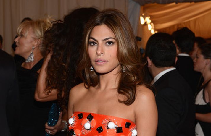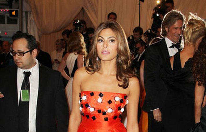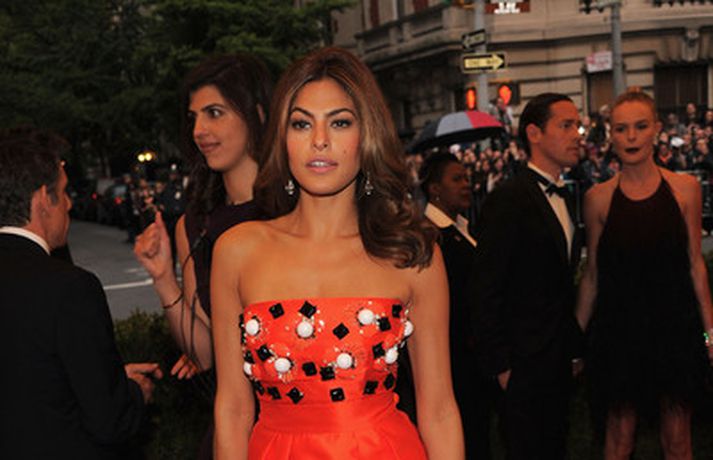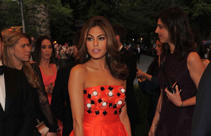 Hin þrjátíu og átta ára gamla Eva Mendes vakti vægast sagt athygli á rauða dreglinum í gærkvöldi í New York. Eva var klædd í apperlsínurauðan Prada kjól með hárri klauf og frumlegu skrauti á bringunni. Öll smáatriði voru í lagi, neglurnar lakkaðar, hárið fallegt og förðunin látlaus. Leikkonan bar Prada tösku við kjólinn og klæddist einnig Prada hælaskóm. Í meðfylgjandi myndasafni má einnig sjá Mendes hversdagslega á ferðinni í vikunni.