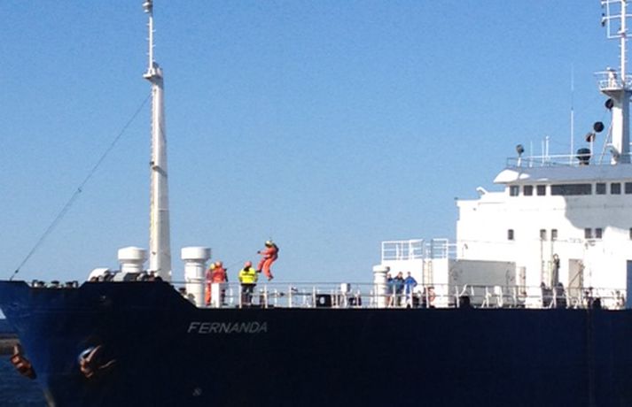 Erlent flutningaskip strandaði við Sandgerðishöfn í morgun. Skipið heitir Fernanda/J7AM7 og er skráð í Dóminíska lýðveldinu. Fernanda er 75 metra langt og 7.576 brúttótonn. Ellefu manns eru um borð í skipinu og heilsast öllum vel samkvæmt upplýsingum frá Landhelgisgæslunni. Talið er að skipið hafi misst af beygju þegar það sigldi með lóðs inn í höfnina og strandað í kjölfarið.Frá Sandgerði í morgun.mynd/fréttastofaBjörgunarskipið í Sandgerði og þyrla Landhelgisgæslunnar eru á staðnum. Þá er varðskipið Þór nú á leið á staðinn. Ekki verður hægt að losa skipið fyrr en seinnipartinn í dag en flóð er klukkan fimm í dag. Þyrla Landhelgisgæslunnar mun fljúga yfir flutningaskipið til að kanna hvort olía leiki frá því. Hún verður síðan til taks á svæðinu ef á þarf.