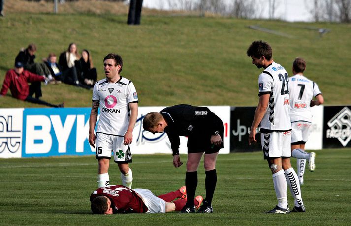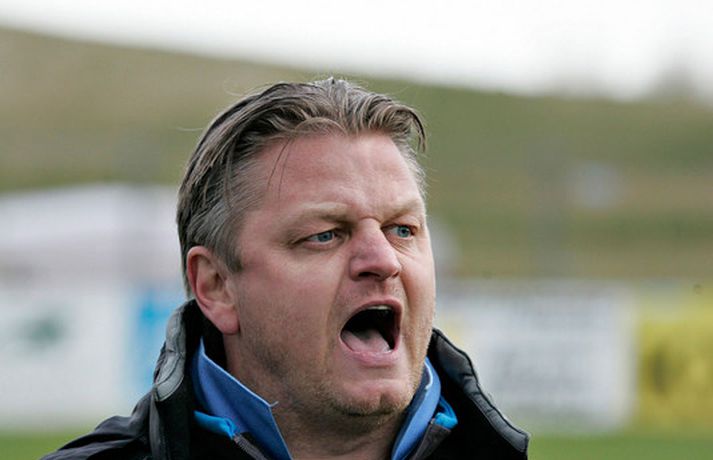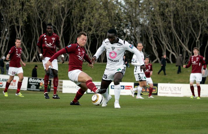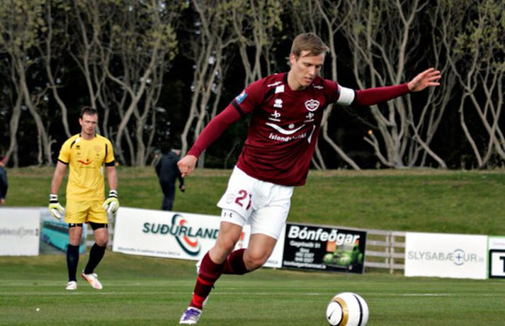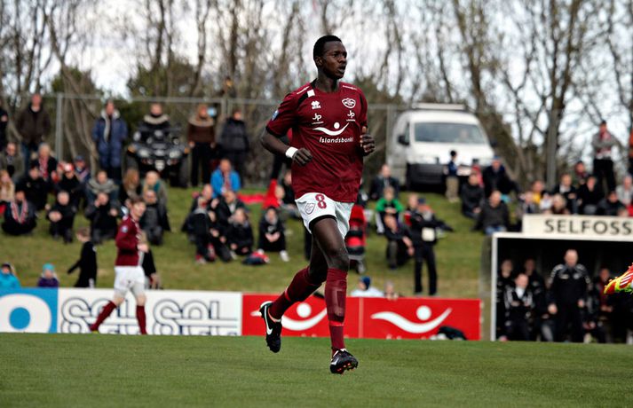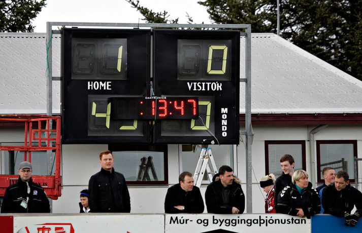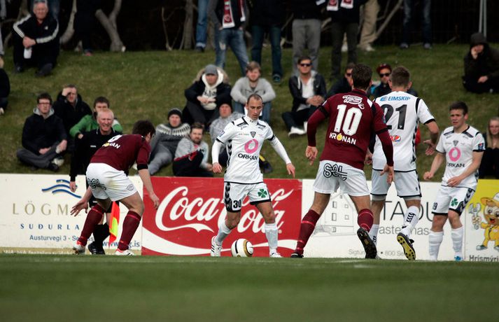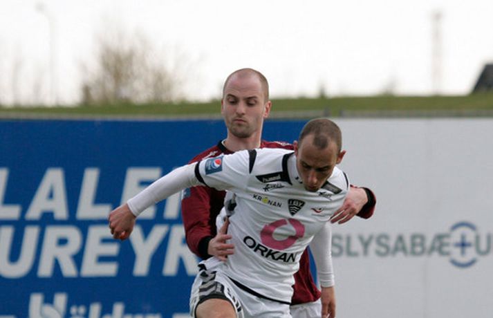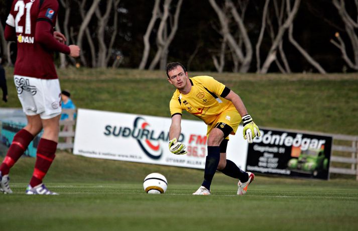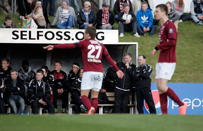 Ingólfur Þórarinsson, betur þekktur sem Ingó Veðurguð, stjórnaði miðjunni hjá Selfyssingum í kvöld þegar fyrsti leikur Pepsi-deildarinnar í ár fór fram. Ingó stýrði sínum mönnum til 2-1 sigurs á óslípuðum Eyjamönnum. ÍBV mætti varla til leiks í fyrri hálfleik - voru enn í Herjólfi - og voru 2-0 undir í að honum loknum. Ólafur Karl Finsen skoraði mark úr víti strax á fimmtu mínútu og Jón Daði Böðvarsson bætti öðru marki um miðbik hálfleiksins. Selfyssingar í bullandi stuði í fyrri hálfleik þar sem téður Ingólfur og Babacar Sarr stjórnuðu umferðinni. Síðari hálfleikur fór í langar spyrnur og minna fjör þó menn tækjust hressilega á en Þórarinn Ingi Valdimarsson minnkaði muninn með marki úr víti. Boltinn fór þá í hendina á Endre Brenne og víti dæmt. Lengra komust Eyjamenn ekki og Selfyssingar fögnuðu vel og innilega með Ingólf í fararbroddi þó lagið Hugarró hafi fengið að hljóma eftir leik. Það verður líklega lagað fyrir næsta heimaleik.Ingólfur: Veit ekki á hverju menn byggja þessar spár „Heilt yfir vorum við bara nokkuð ánægðir með þennan sigur," sagði Ingólfur Þórarinsson en hann átti stjörnuleik á miðjunni í kvöld. „Það var ágætis spil í okkar liði en við hefðum kannski þurft að vera rólegri í byrjun á boltanum. Vorum, kannski eðlilega, nokkuð stressaðir og kýldum boltanum langt fram en það spilast á reynsluleysi." Selfyssingum var spáð neðsta sæti deildarinnar í flestum fjölmiðlum. „Ég veit ekki alveg á hverju menn byggja þessa spár. Við erum með fínt lið og erum sterkir þegar við þorum að spila boltanum - þá erum við til alls líklegir," sagði Ingólfur með sínu fallega brosi.Magnús: Leikmenn ekki í agabanni „Við mættum ekki klárir til leiks," sagði Magnús Gylfason, þjálfari ÍBV, eftir leikinn. „Við fengum á okkur víti en mér fannst að það átti að dæma á þá fyrir bakhrindingu. Við gerðum svo klaufaleg mistök í seinna markinu - barnaleg mistök í rauninni og gefum það mark," bætti hann við. „Við reyndum að spila fótbolta en við vorum ekki nógu klárir og því fór sem fór." Tryggvi Guðmundsson er ekki nálægt liðinu en er samt umtalaðasti fótboltamaður landsins eftir að hann var handtekinn ölvaður bak við stýri. Hann er nú í meðferð. Magnús sagði að umræðan um mál Tryggva hafði ekkert með þennan leik að gera. „Nei það held ég ekki. Hann á við sín mál í dag og við vorum ekki að hugsa um það. Það sem fór með þennan leik var að við vorum ekki klárir í upphafi." Magnús neitaði einnig að ÍBV leikmenn hefðu fengið sér í tánna á fimmtudag eins og vísir hefur heimildir fyrir og hefðu verið settir í agabann. „Það var ekkert svoleiðis. Við mættum með 18 í dag og ég treysti þeim fyrir þessum leik."