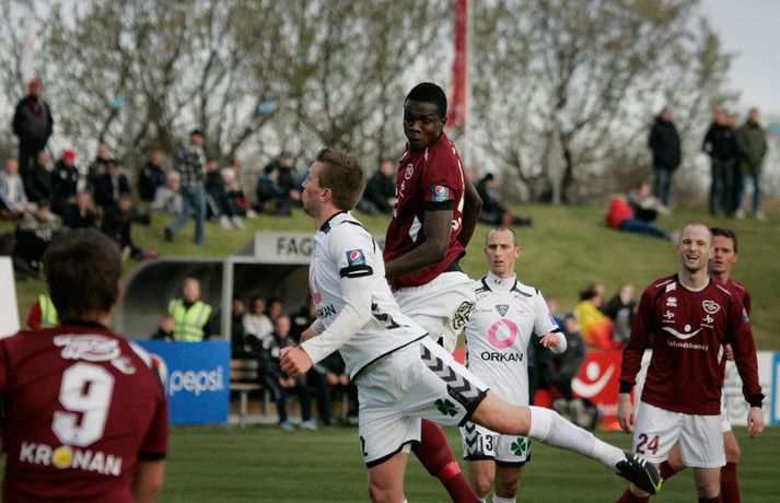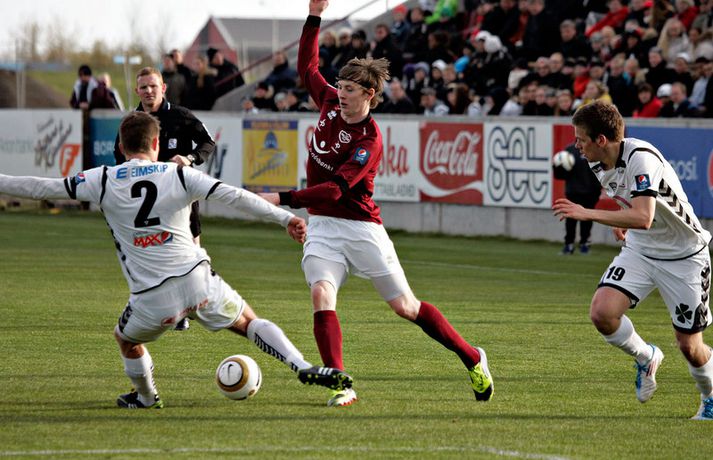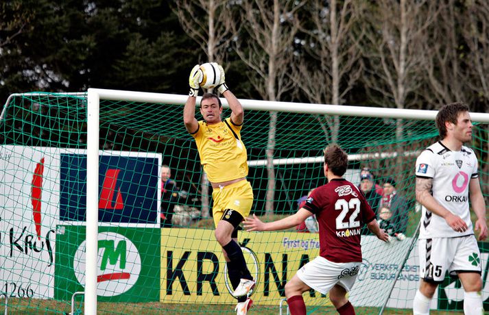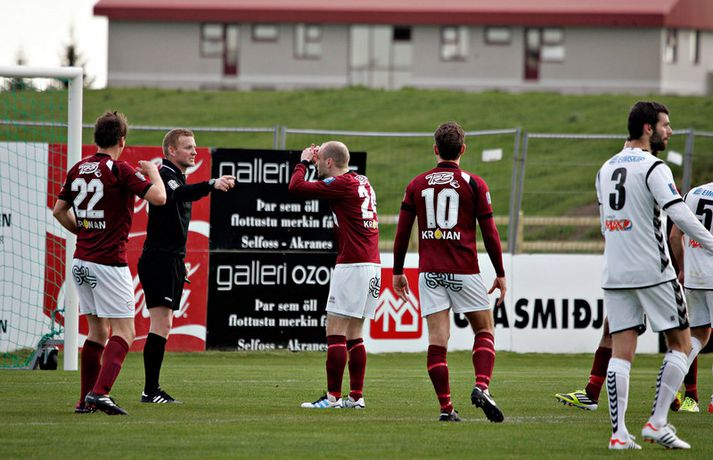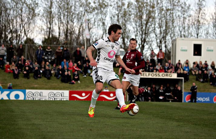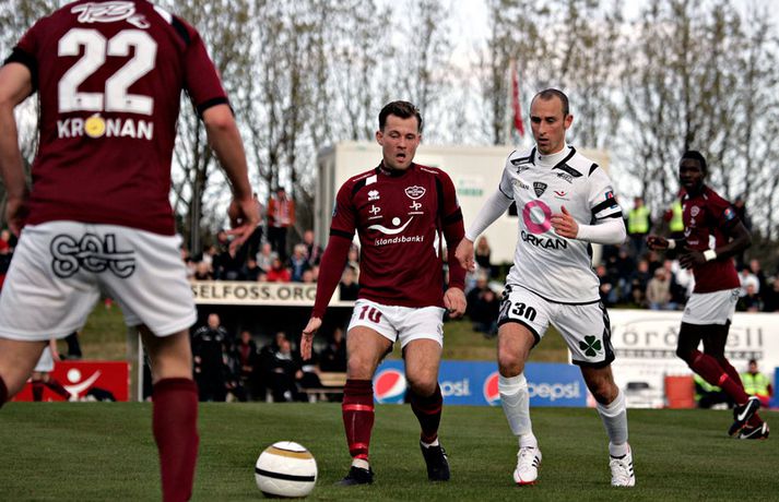 Umfjöllun og viðtöl: Selfoss - ÍBV 2-1 | Veðurguðinn bauð í partí Benedikt Bóas Hinriksson á Selfossvelli skrifar 6. maí 2012 00:01 Mynd/Daníel Ingólfur Þórarinsson, betur þekktur sem Ingó Veðurguð, stjórnaði miðjunni hjá Selfyssingum í kvöld þegar fyrsti leikur Pepsi-deildarinnar í ár fór fram. Ingó stýrði sínum mönnum til 2-1 sigurs á óslípuðum Eyjamönnum. ÍBV mætti varla til leiks í fyrri hálfleik - voru enn í Herjólfi - og voru 2-0 undir í að honum loknum. Ólafur Karl Finsen skoraði mark úr víti strax á fimmtu mínútu og Jón Daði Böðvarsson bætti öðru marki um miðbik hálfleiksins. Selfyssingar í bullandi stuði í fyrri hálfleik þar sem téður Ingólfur og Babacar Sarr stjórnuðu umferðinni. Síðari hálfleikur fór í langar spyrnur og minna fjör þó menn tækjust hressilega á en Þórarinn Ingi Valdimarsson minnkaði muninn með marki úr víti. Boltinn fór þá í hendina á Endre Brenne og víti dæmt. Lengra komust Eyjamenn ekki og Selfyssingar fögnuðu vel og innilega með Ingólf í fararbroddi þó lagið Hugarró hafi fengið að hljóma eftir leik. Það verður líklega lagað fyrir næsta heimaleik.Ingólfur: Veit ekki á hverju menn byggja þessar spár „Heilt yfir vorum við bara nokkuð ánægðir með þennan sigur," sagði Ingólfur Þórarinsson en hann átti stjörnuleik á miðjunni í kvöld. „Það var ágætis spil í okkar liði en við hefðum kannski þurft að vera rólegri í byrjun á boltanum. Vorum, kannski eðlilega, nokkuð stressaðir og kýldum boltanum langt fram en það spilast á reynsluleysi." Selfyssingum var spáð neðsta sæti deildarinnar í flestum fjölmiðlum. „Ég veit ekki alveg á hverju menn byggja þessa spár. Við erum með fínt lið og erum sterkir þegar við þorum að spila boltanum - þá erum við til alls líklegir," sagði Ingólfur með sínu fallega brosi.Magnús: Leikmenn ekki í agabanni „Við mættum ekki klárir til leiks," sagði Magnús Gylfason, þjálfari ÍBV, eftir leikinn. „Við fengum á okkur víti en mér fannst að það átti að dæma á þá fyrir bakhrindingu. Við gerðum svo klaufaleg mistök í seinna markinu - barnaleg mistök í rauninni og gefum það mark," bætti hann við. „Við reyndum að spila fótbolta en við vorum ekki nógu klárir og því fór sem fór." Tryggvi Guðmundsson er ekki nálægt liðinu en er samt umtalaðasti fótboltamaður landsins eftir að hann var handtekinn ölvaður bak við stýri. Hann er nú í meðferð. Magnús sagði að umræðan um mál Tryggva hafði ekkert með þennan leik að gera. „Nei það held ég ekki. Hann á við sín mál í dag og við vorum ekki að hugsa um það. Það sem fór með þennan leik var að við vorum ekki klárir í upphafi." Magnús neitaði einnig að ÍBV leikmenn hefðu fengið sér í tánna á fimmtudag eins og vísir hefur heimildir fyrir og hefðu verið settir í agabann. „Það var ekkert svoleiðis. Við mættum með 18 í dag og ég treysti þeim fyrir þessum leik." Pepsi Max-deild karla Mest lesið Býst núna við því versta frá áhorfendum Sport Fótboltaþjálfari og þrjú börn hans létust í jólafríinu Fótbolti Klúðraði gullgreininni sinni: „Ég er enn í áfalli“ Sport „Enginn vildi að ég myndi vinna“ Sport „Ég hélt ég myndi deyja“ Enski boltinn Jokic lá þjáður eftir og tímabilið í hættu Körfubolti Gleymdi Íslendingurinn fékk loks að spila: „Ég er ekki vitlaus“ Fótbolti Nottingham Forest vill fá að heyra samtöl dómaranna Enski boltinn „Fróðari menn segja að maður eigi ekki að láta tilfinningarnar ráða“ Enski boltinn Hetjuleg barátta dugði ekki gegn heimsmeisturunum Handbolti Fleiri fréttir Enn kvarnast úr liði Blika Leið Víkings að titlinum rifjuð upp í kvöld Þjálfar 2. flokk samhliða því að spila fyrir KR Færeysk landsliðskona til liðs við ÍBV Býst ekki við að spila aftur fyrir landsliðið Kynntu Sigurð á slaginu sex á aðfangadag Heyrði hvorki frá Blikum né Víkingum Úr Bestu heim í Hauka „Þetta er stærsti klúbbur Íslands“ Sagan ekki sönn: „Veit ekki hvaðan þetta á að hafa komið“ Meira en 37 stöðugildi hjá Knattspyrnusambandi Íslands Óskar Hrafn um komu Arnórs Ingva: „Gífurlega dýrmætt fyrir KR“ Arnór Ingvi orðinn leikmaður KR Breiðablik kaupir Jónatan frá Norrköping Elías mættur til meistaranna KR sagt vera að landa Arnóri Ingva Hilmar Árni til starfa hjá KR Segir fjórðung í bók Óla ósannan Víkingur í úrslit Bose-bikarsins eftir sigur „Verið heiður að spila í appelsínugulu með frábærum liðsfélögum“ Þekkir Egilshöllina vel og skoraði gegn fyrrum félögum Strákar Heimis Guðjóns fengu slæman skell í fyrsta leik Axel verður áfram hjá Aftureldingu Kveður pabba sinn í Laugardalnum og fer til FH „Félag sem var í basli með að ná endum saman og greiða laun á réttum tíma“ Skrýtið og taktlaust: „Ég er ekkert sátt með niðurstöðuna“ Fanndís kveður sviðið: „Ég er búin að fella nokkur tár“ Gylfi með tvö og Víkingar byrja á sigri Frá Akureyri til Danmerkur Markadrottningin heldur að landsliðið sé búið spil Sjá meira