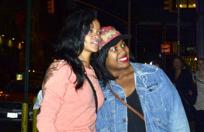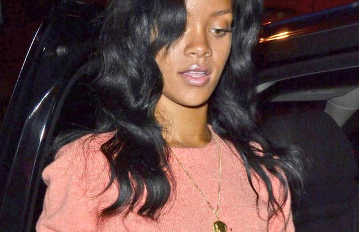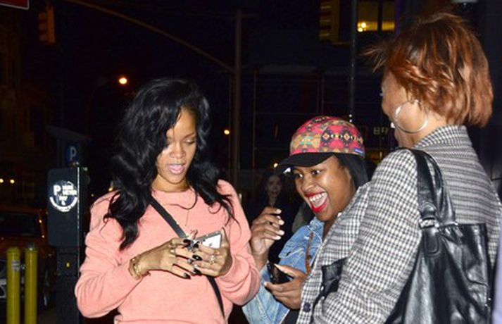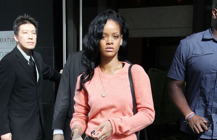 Rihanna var afslöppuð um helgina og sinnti aðdáendum sínum af mikilli þolinmæði fyrir utan hótelið sem hún dvelur á þessa dagana. Eins og sjá má í myndasafni var söngkonan hversdagsleg til fara, með slegið hár og lítið förðuð.