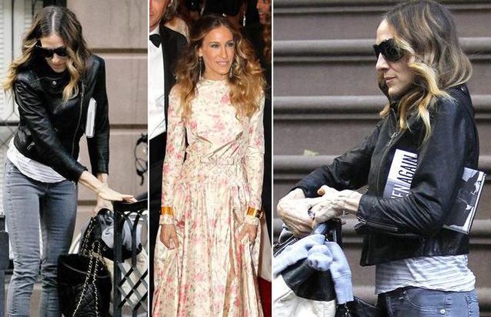 Leikkonan Sarah Jessica Parker, 47 ára, yfirgaf heimili sitt í leðurjakka með bók í hönd í gær, mæðradaginn. Þá má sjá hana í glæsilegum Valentino kjól og Manolo Blahnik skóm á rauða dreglinum. Það skiptir ekki máli hvort Jessica klæðist gallabuxum eða kjól - hún er ávallt smart.