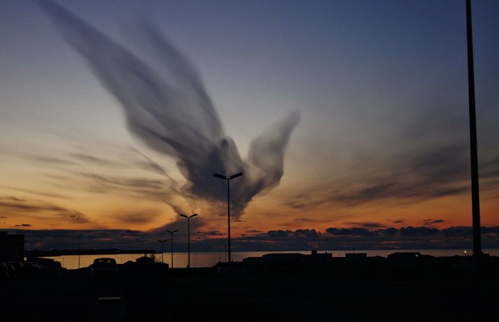 Risafugl á flugi yfir Reykjanesbæ Gissur Sigurðsson skrifar 10. maí 2012 07:07 Mynd/Ingvar Vilhjálmsson Mjög sérstætt skýjafar sást víða af Reykjanesi um ellefu leytið í gærkvöldi, þegar skýjaslæða á annars heiðum himni tók á sig hinar ýmsu kynjamyndir. Um tíma var eins og risavaxinn fugl væri að hefja sig til flugs og náðust margar góðar myndir af fyrirbærinu. Að sögn Veðurstofunnar varð vart við svonefnd netjuský á þessum slóðum í gærkvöldi og gæti þetta verið hluti af þeim. Myndirnar tóku Ingvar Vilhjálmsson, Anna Sigga og Vilborg Hannesdóttir. Mest lesið „Því miður er verklagið þannig“ Innlent Reyndu að fá flugmann Maduros til að aðstoða við handtöku hans Erlent Ökumaður stöðvaður með snjófargan á framrúðunni Innlent Andrés ekki lengur prins og látinn yfirgefa heimili sitt Erlent Viðbrögð hjólreiðamannsins að einhverju leyti skiljanleg Innlent Fjárhagsstaðan alvarleg og tímabundin ráðning ráðgjafans ekki endurnýjuð Innlent Öldungadeildin samþykkir að ógilda tollaákvarðanir Trump Erlent Opnun Brákarborgar frestað enn á ný Innlent Hvasst, hlýtt og von á asahláku eða glerhálku Veður Fastur heima í þrjá daga út af engum mokstri Innlent Fleiri fréttir Ökumaður stöðvaður með snjófargan á framrúðunni „Því miður er verklagið þannig“ Opnun Brákarborgar frestað enn á ný Ögmundur Ísak ráðinn til þingflokks Sjálfstæðisflokksins Viðbrögð hjólreiðamannsins að einhverju leyti skiljanleg Fjárhagsstaðan alvarleg og tímabundin ráðning ráðgjafans ekki endurnýjuð Formannskosningu Pírata frestað Fastur heima í þrjá daga út af engum mokstri Þurfa mögulega að fresta formannskosningu vegna formgalla Flughálka í kortunum, breytingar hjá bönkunum og formaður Pírata Reyna að lokka íslenska lækna heim Óvenjulegir smáskjálftar reyndust sprengingar Ein hinna reknu segir konunum kastað fyrir ljónin Fylgjast með smáskjálftum við Bláa lónið Kirkjuþing skorar á stjórnvöld að hækka sóknargjald Ósammála ráðherra um að atkvæðajafnvægi sé mannréttindamál Ungir innflytjendur á Íslandi ekki jafn jaðarsettir og í Svíþjóð Leita til UNESCO vegna Vonarskarðs og kæra kynjahalla Aukin verðbólga áhyggjuefni og asahláka í kortunum Spyr hvort ökumenn myndu keyra á gangandi á götunni Séra Flosi Magnússon fallinn frá Að jafnaði tilkynnt um tólf kynferðisbrot í hverri viku Var ofurölvi þegar hann hljóp yfir Reykjanesbraut „Auðvitað slær þetta mig ekki vel“ Fundi slitið án árangurs og nýr ekki boðaður „Fyrstu þrjú árin sem ég var veik voru algjört helvíti“ Vill sjá byggingakrana í Úlfarsárdal á næsta ári Reikna með flughálum vegum Fagnar aðgerðum en telur húsnæðispakkann „fremur rýran“ Úrskurðarnefnd klofin en framkvæmdaleyfi stendur Sjá meira
