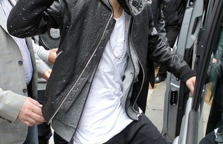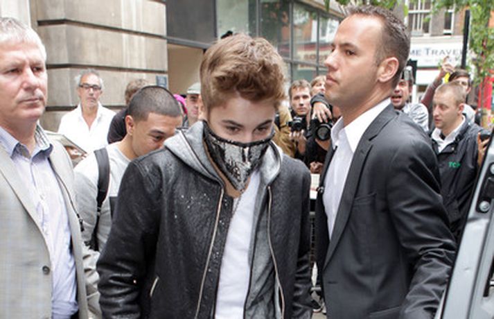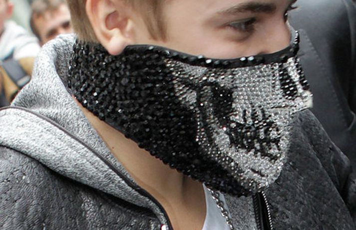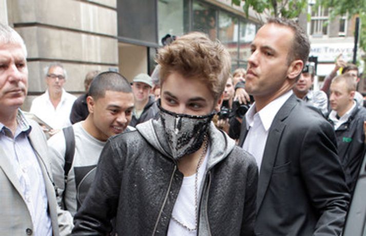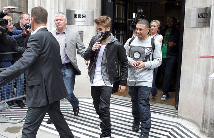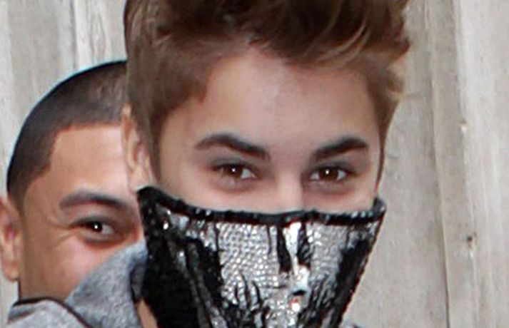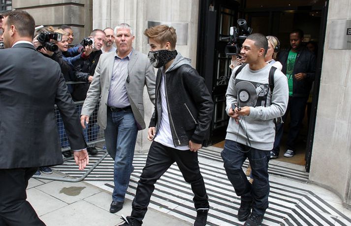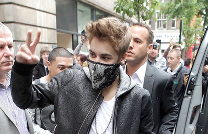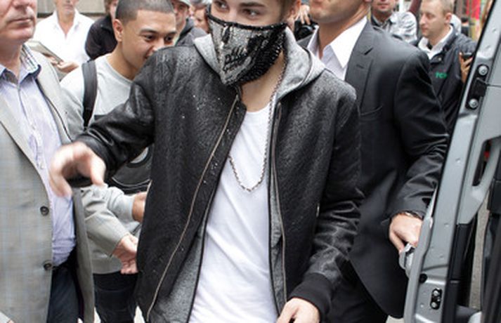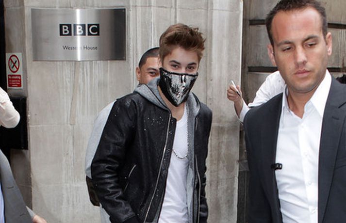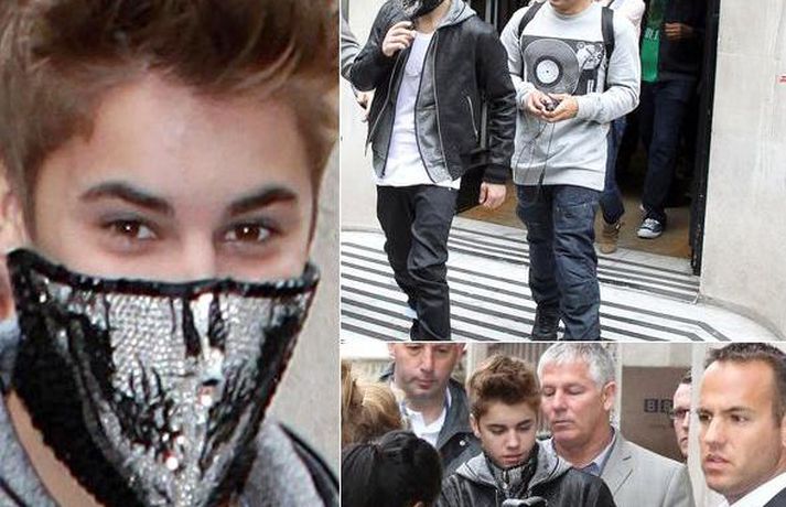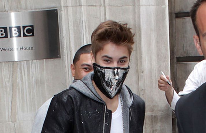 Poppstjarnan Justin Bieber, 18 ára, vakti athygli þegar hann yfirgaf BBC stöðvarnar í London í Englandi í gær. Eins og sjá má var söngvarinn með hauskúpu-skreytta grímu fyrir andlitinu. Hann skrifaði á Twitter síðuna sína síðar sama dag: LONDON IS CRAZY!! LOVING IT!! Skoða má grímuklæddan Bieber í myndasafni.