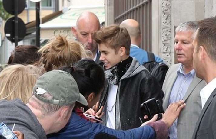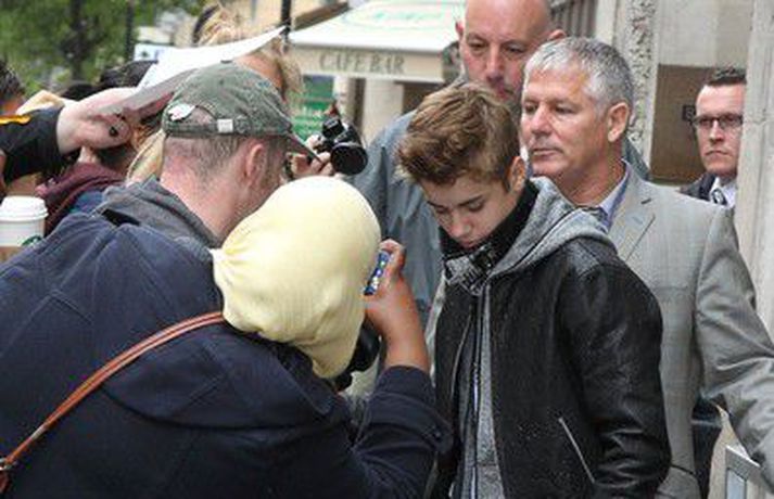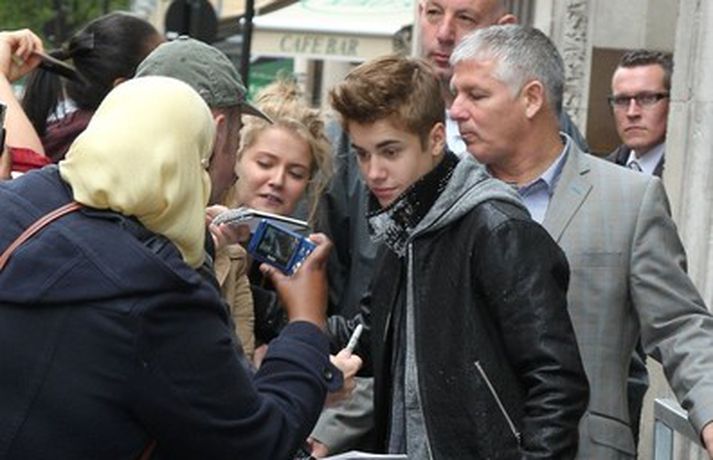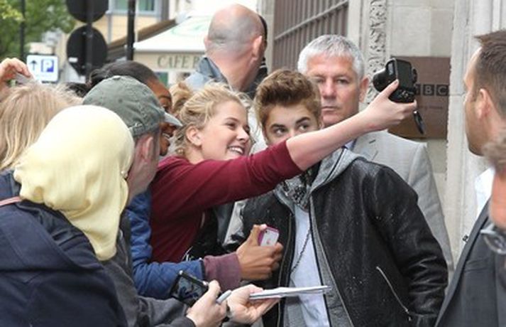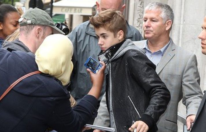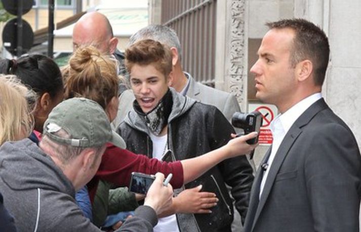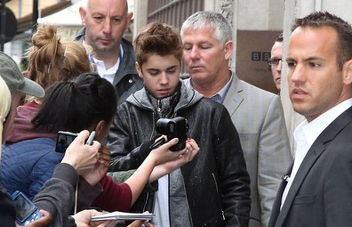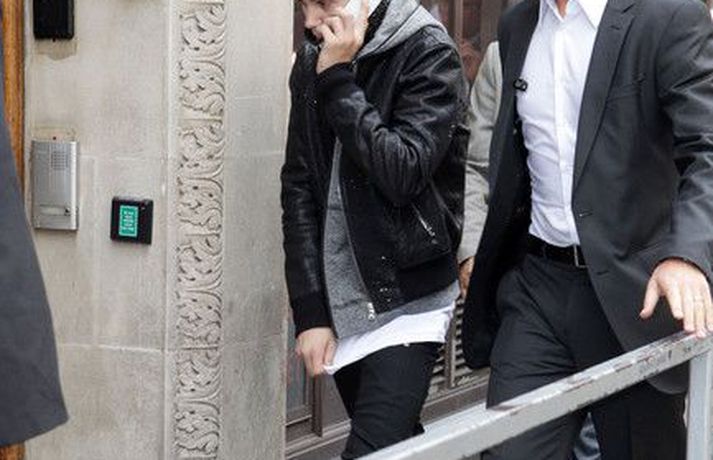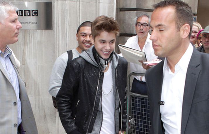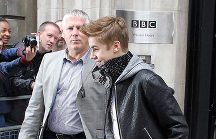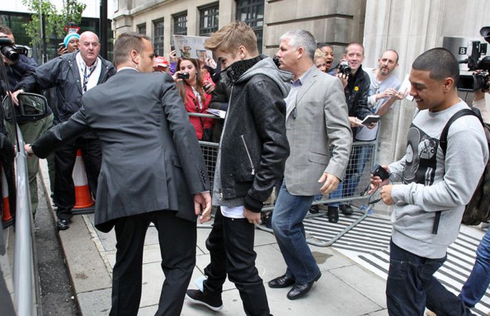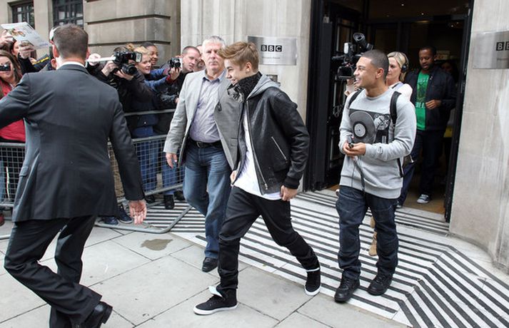 Poppstjarnan Justin Bieber, 18 ára, vakti athygli þegar hann yfirgaf BBC stöðvarnar í London í Englandi í gær. Eins og sjá má var söngvarinn með hauskúpu-skreytta grímu fyrir andlitinu. Hann skrifaði á Twitter síðuna sína síðar sama dag: LONDON IS CRAZY!! LOVING IT!! Skoða má grímuklæddan Bieber í myndasafni.