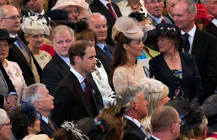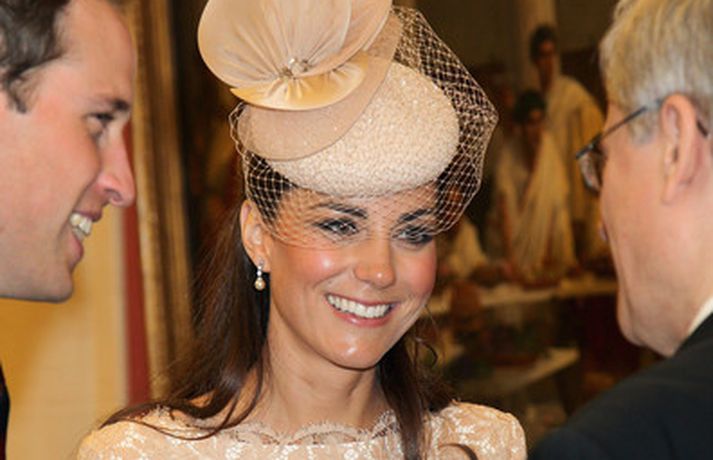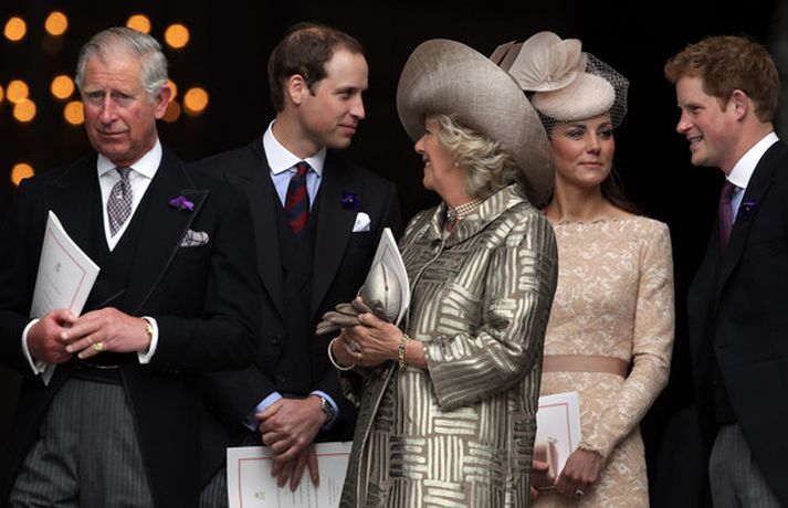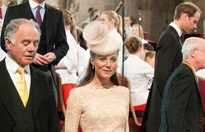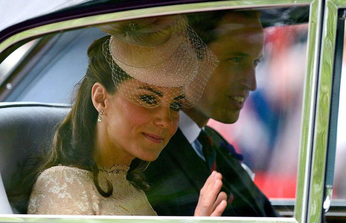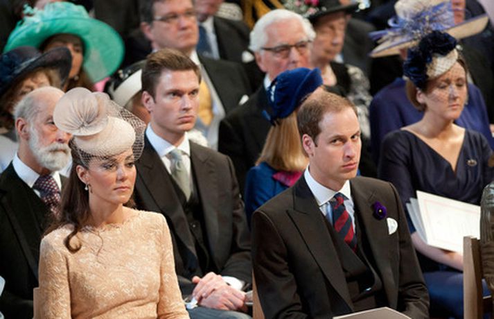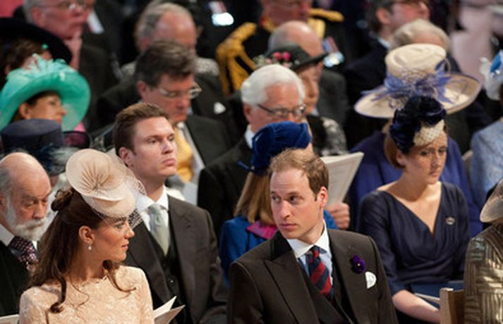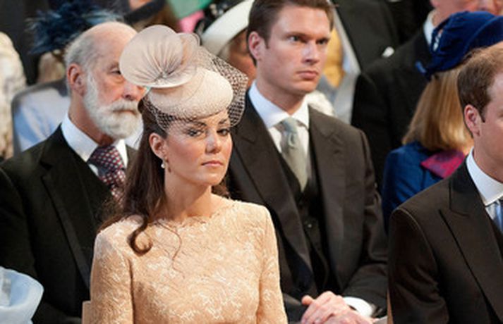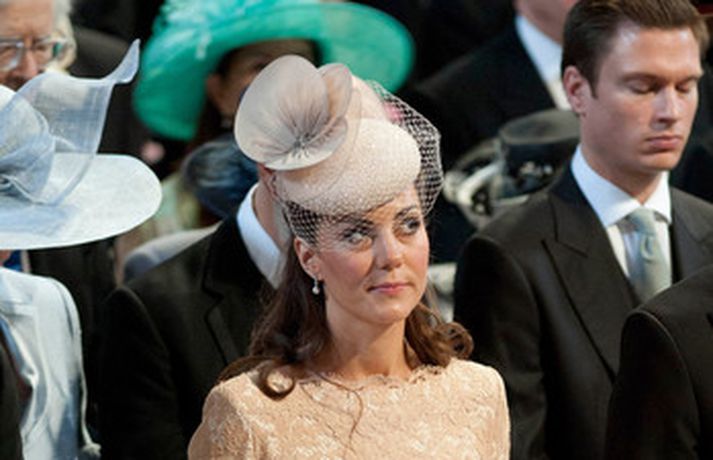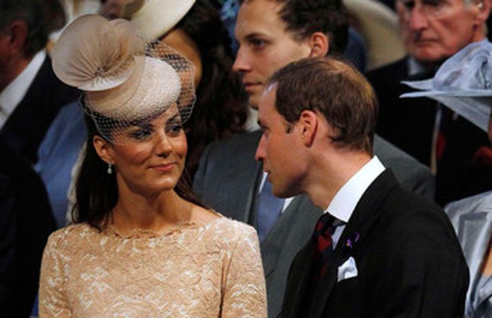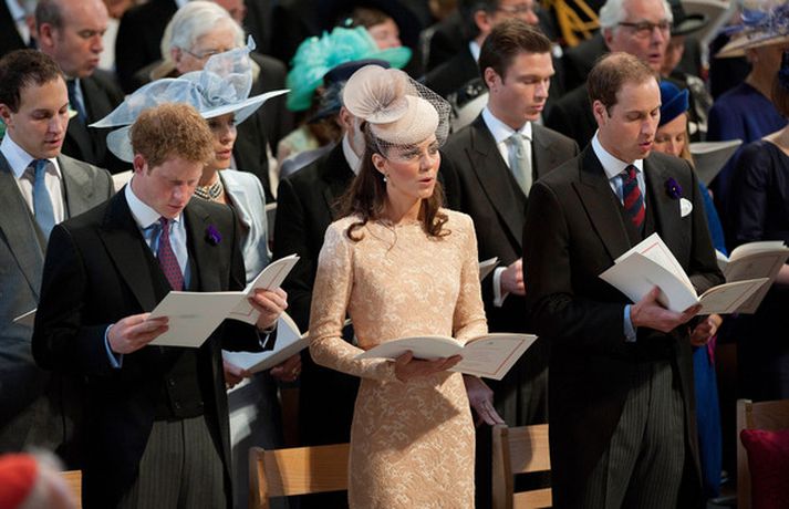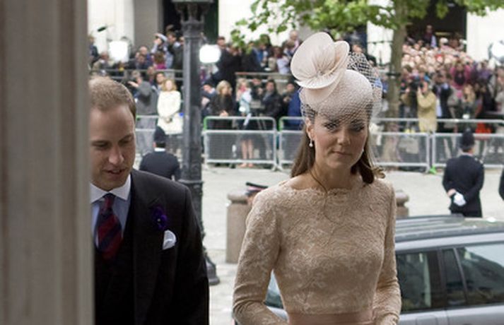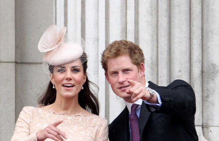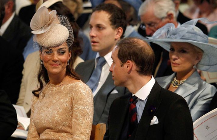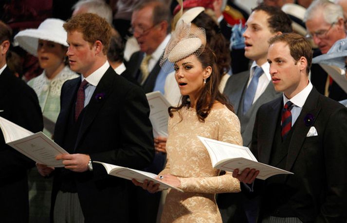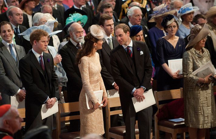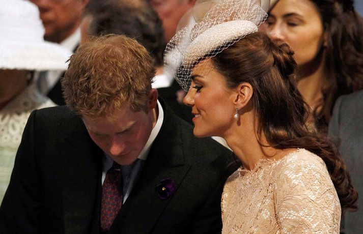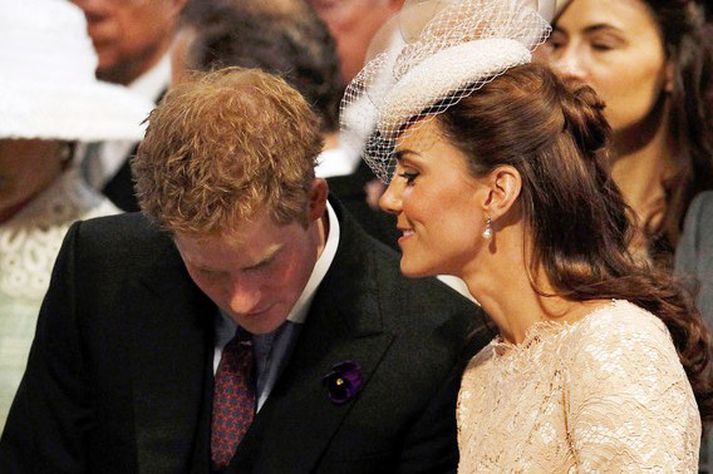 Eins og sjá má á meðfylgjandi myndum var hertogaynjan af Cambridge, Kate Middleton, 30 ára, klædd í föl-bleikan Alexander McQueen kjól sem var vægast sagt glæsilegur á henni. Hún toppaði heildarútlitið með fallegan Jane Taylor hatt á höfði. Ekki nóg með að Kate steli senunni hvert sem hún kemur heldur er greinilegt að hún og Harry, bróðir Vilhjálms eiginmanns hennar, nái vel saman. Breska konungsfjölskyldan hefur tekið henni opnun örmum á því leikur enginn vafi. Harry hefur sagt að Kate sé systirin sem hann eignaðist aldrei.myndir/cover media