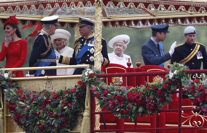 Þrítuga Kate Middleton hertogaynjan af Cambridge var rauðklædd eins og sjá má í myndasafni þegar hún mætti ásamt prinsinum sínum, Vilhjálmi, í Lundúnarborg í gær til að fagna farsælum ferli Elísabetar Bretadrottningar sem núverandi drottning breska konungsveldisins. Þá má sjá Charles prins og eiginkonu hans Camillu sem var ekki síðri klæddí ljósa dragt með hatt í sama lit sem fór henni einstaklega vel.myndir/cover media