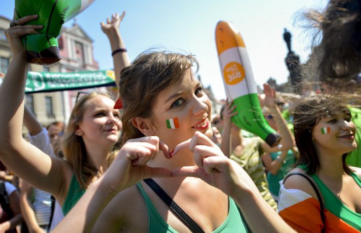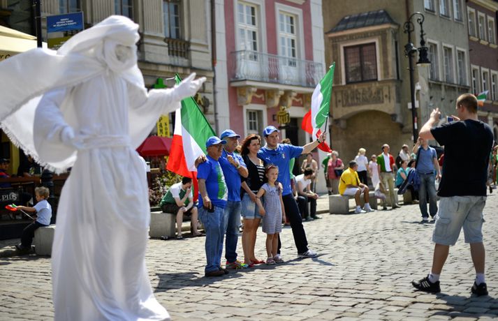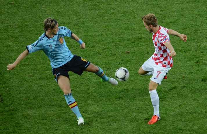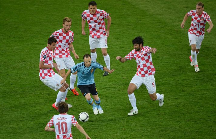 Spánverjar og Ítalir unnu lokaleiki sína í C-riðli Evrópumótsins í fótbolta í kvöld og tryggðu sér sæti í átta liða úrslitum. Ítalir voru ekki í miklum vandræðum með að vinna Íra 2-0 en Spánverjar sluppu með skrekkinn á móti Króötum og tryggðu sér síðan 1-0 sigur í blálokin. Antonio Cassano og Mario Balotelli skoruðu mörk Ítala á móti Írum. Cassano skoraði fyrra markið með skalla eftir hornspyrnu Andrea Pirlo. í fyrri hálfleik en Balotelli það síðara í lokin með frábæru viðstöðulausu skoti eftir að hafa komið inn á sem varamaður. Spánverjar tryggðu sér sigur í riðlinum með því að vinna 1-0 sigur á Króatíu. Jesús Navas kom inn á sem varamaður fyrir Fernando Torres eftir klukkutíma og skoraði eina markið leiksins tveimur mínútum fyrir leikslok. Ljósmyndarar AFP-fréttastofunnar voru að sjálfsögðu mættir með myndavélar sínar á leikina í kvöld og við höfum tekið saman myndasyrpu frá leikjum dagsins. Myndirnar má sjá í albúminu hér að neðan. Hægt er að sjá myndirnar stærri með því að smella á þær.
