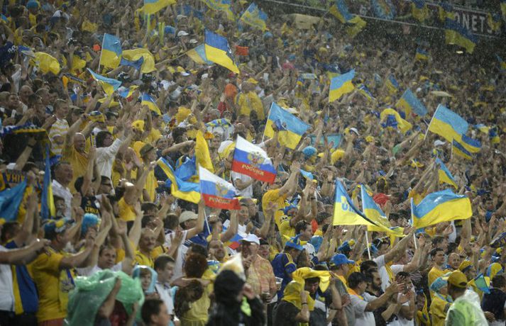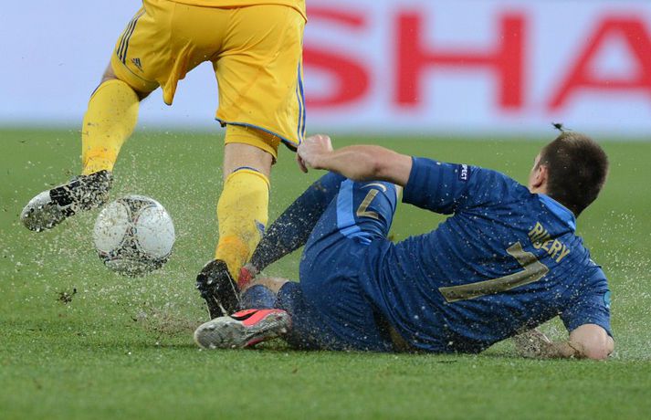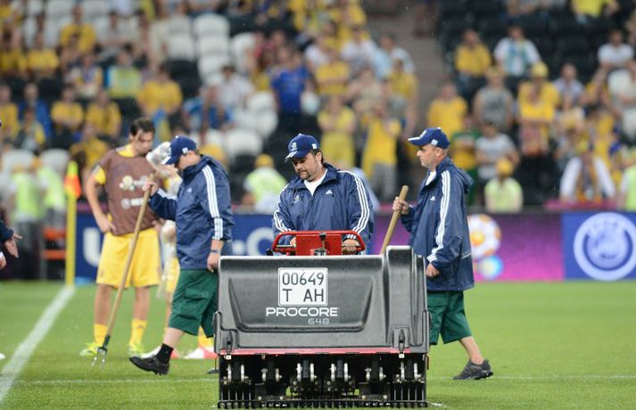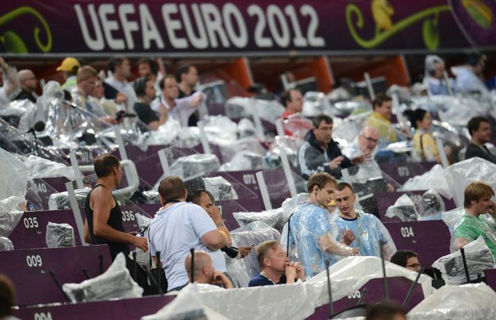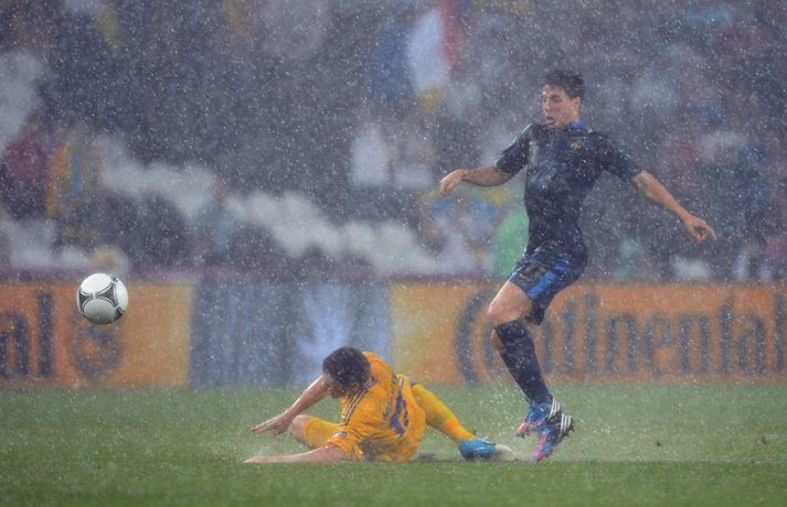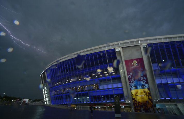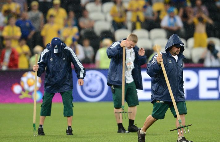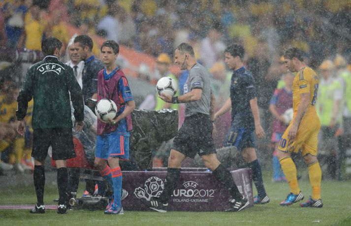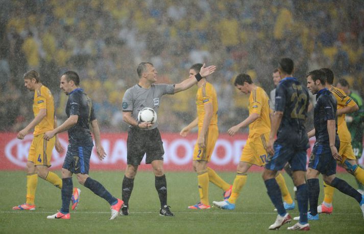 Hollenski dómarinn Björn Kuipers stöðvaði leik Úkraínu og Frakklands eftir tæplega fimm mínútna leik vegna rigningar og eldinga. Leik var frestað um tæpan klukkutíma á meðan dómari leiksins réð ráðum sínum. Aðstæður til knattspyrnuiðkunar voru bæði afar slæmar vegna bleytu á vellinum. Þá var ljósabúnaður í rjáfri stúku leikvangsins einnig í hættu vegna eldingahættu. Hér til hliðar má sjá nokkrar magnaðar myndir frá Donetsk í boði AFP Nordic.