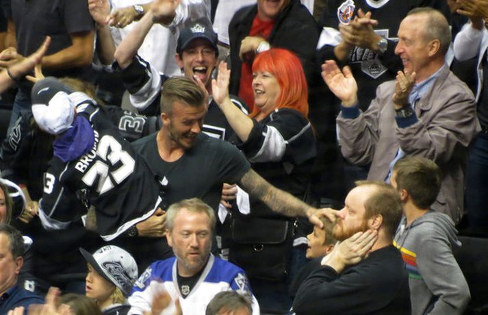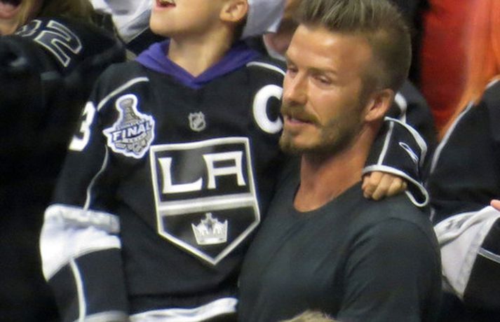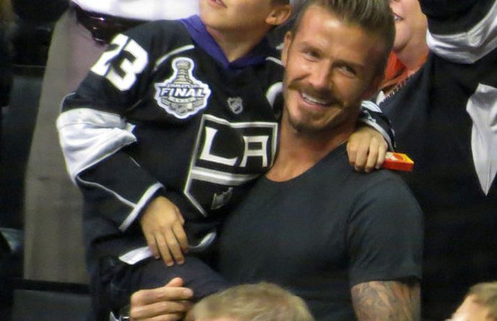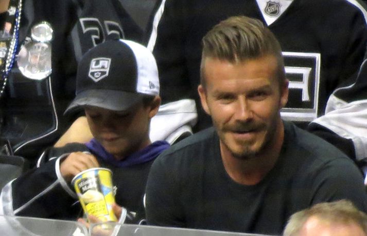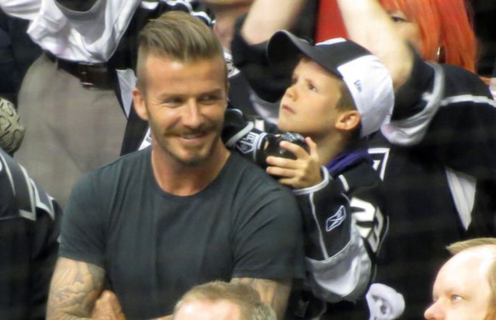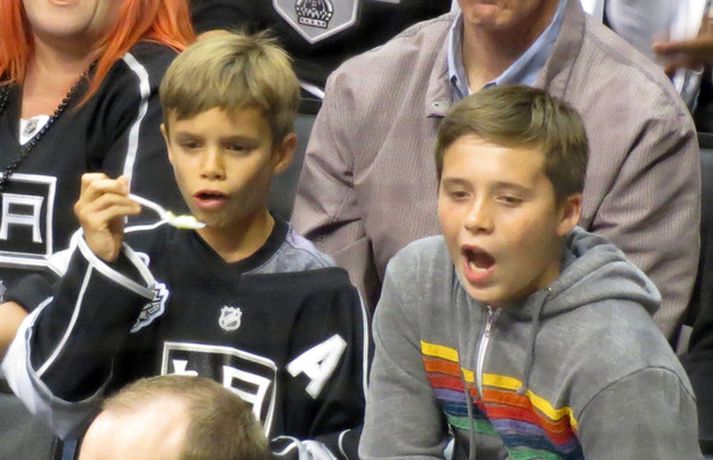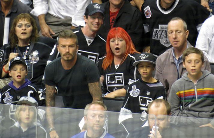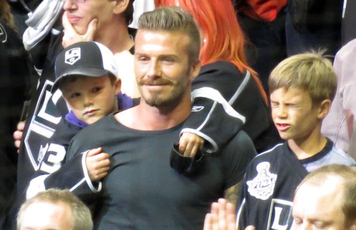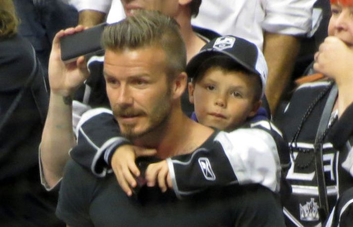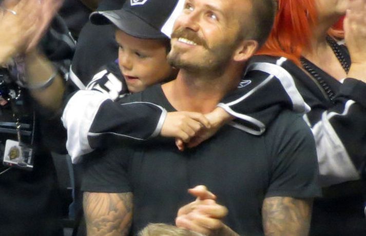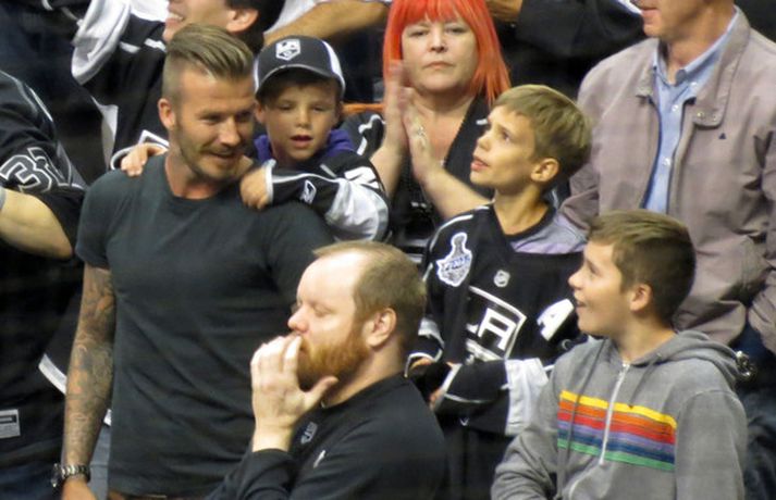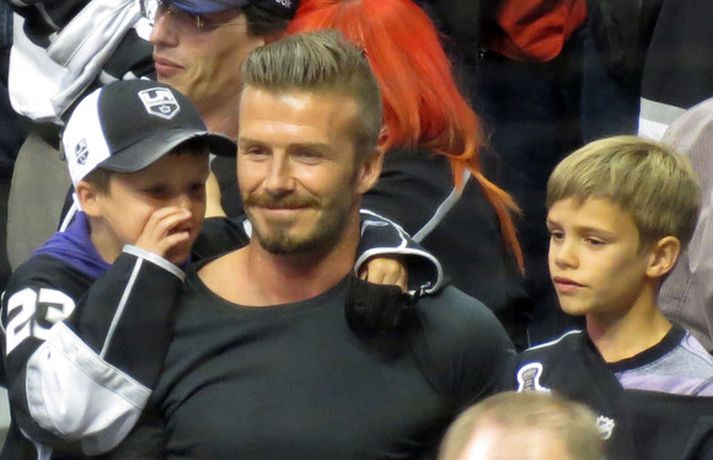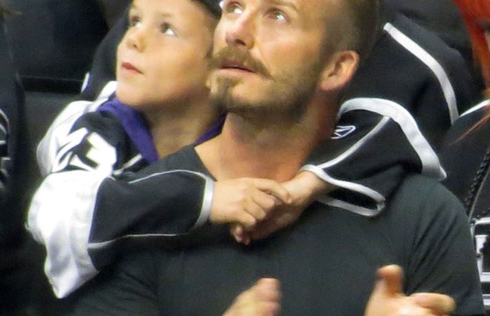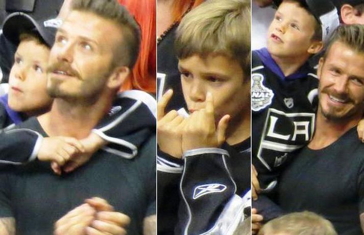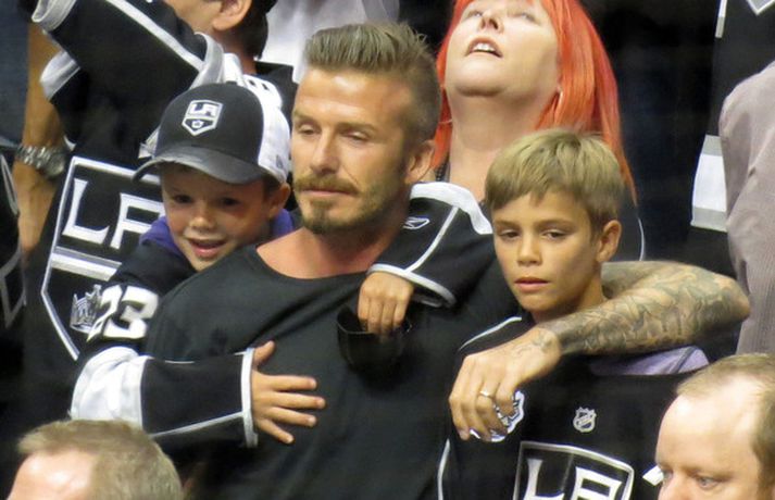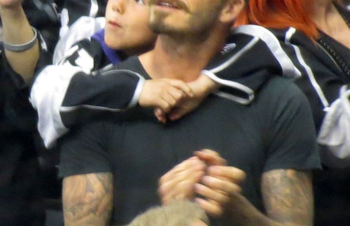 Fótboltastjarnan David Beckham var myndaður á körfuboltaleik í Los Angeles í gær ásamt sonum sínum Cruz, Romeo og Brooklyn. Drengirnir snæddu sér á kartöfluflögum og borðuðu ís á meðan á leiknum stóð. Eins og sjá má fór vel á með feðgunum.