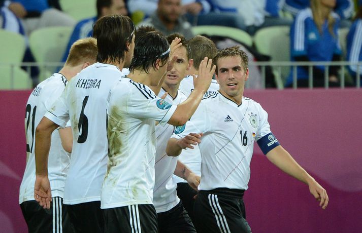 Þjóðverjar eru komnir í undanúrslitin á EM í fótbolta eftir sannfærandi 4-2 sigur á Grikkjum í átta liða úrslitum í kvöld. Joachim Löw, þjálfari þýska liðsins, skipti um sóknarlínu hjá þýska liðinu og tveir af nýju framherjunum. Miroslav Klose og Marco Reus, skoruðu í leiknum. Hin mörkin gerðu fyrirliðinn Philipp Lahm og miðjumaðurinn Sami Khedira. Þjóðverjar mæta annaðhvort Englandi eða Ítalíu í undanúrslitunum en þær þjóðir mætast í átta liða úrslitunum á sunnudagskvöldið. Þjóðverjar höfðu mikla yfirburði í þessum leik en urðu fyrir smá áfalli þegar Grikkjum tókst að jafna gegn gangi leiksins eftir tíu mínútna leik í seinni hálfleik. Þjóðverjar svöruðu með tveimur mörkum á þrettán mínútum og unnu að lokum mjög öruggan og sannfærandi sigur. Joachim Löw, þjálfari Þjóðverja, ákvað að hvíla stórstjörnurnar Lukas Podolski, Thomas Müller og Mario Gomez í leiknum en sá síðastnefndi er markahæsti leikmaður keppninnar með þrjú mörk ásamt Króatanum Mario Mandzukic, Rússanum Alan Dzagoev og Cristiano Ronaldo frá Portúgal.Miroslav Klose, Andre Schurrle og Marco Reus byrjuðu því í fremstu víglínu Þjóðverja. Miroslav Klose setti boltann í markið eftir fjórar mínútur þegar hann fylgdi eftir skoti Sami Khedira en markið var dæmt af vegna rangstöðu. Þjóðverjar voru með öll völd á vellinum frá byrjun og um miðjan hálfleikinn fengu þeir þrjú góð færi á stuttum tíma þar sem Marco Reus var í aðalhlutverki í öll skiptin. Markið lét þó bíða aðeins eftir sér. Andre Schurrle og Sami Khedira voru líka búnir að fá færi þegar fyrirliðinn Philipp Lahm kom þýska liðinu í 1-0 á 39. mínútu með frábæru langskoti af 22 metra færi. Þjóðverjar héldu áfram stórsókn sinni eftir markið en Grikkir héldu út fram í hálfleik. Þjóðverjar byrjuðu seinni hálfleikinn af krafti en urðu síðan fyrir smá áfalli á 55. mínútu þegar Georgios Samaras jafnaði leikinn fyrir Grikki eftir skyndisókn og sendingu frá Dimitrios Salpingidis. Þýska liðið tók sér þó ekki langan tíma að komast aftur yfir í leiknum því Sami Khedira skoraði á 61. mínútu eftir fyrirgjöf frá Jérome Boateng. Miroslav Klose fór síðan langt með að tryggja Þjóðverjum sigurinn þegar hann skoraði með skalla á 68. mínútu eftir fyrirgjöf frá Mesut Özil. Þetta var 64. mark Klose fyrir þýska landsliðið. Marco Reus fékk tækifærið í byrjunarliðinu og átti mjög flottan leik. Hann kórónaði leikinn sinn með því að koma þýska liðinu í 4-1 á 74. mínútu þegar hann fylgdi á eftir, með glæsilegu skoti í slánna og inn, eftir að Michail Sifakis varði frá Miroslav Klose. Grikkirnir náðu að minnka muninn mínútu fyrir leikslok þegar Jérome Boateng fékk dæmda á sig hendi í teignum og Dimitrios Salpingidis skoraði af öryggi úr vítaspyrnunni.