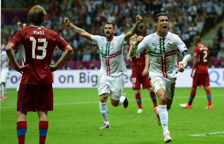 Cristiano Ronaldo skallaði Portúgal inn í undanúrslitin Óskar Ófeigur Jónsson skrifar 21. júní 2012 18:15 Mynd/AP Portúgal varð í kvöld fyrsta þjóðin til þess að tryggja sér sæti í undanúrslitum á Evrópumótinu í fótbolta. Cristiano Ronaldo tryggði þá Portúgal 1-0 sigur á Tékklandi þegar hann skoraði eina mark leiksins ellefu mínútum fyrir leikslok. Cristiano Ronaldo er þar með búinn að skora þrjú mörk í síðustu tveimur leikjum og er heldur betur búinn að stimpla sig inn í þessa keppni. Portúgalir mæta annaðhvort Spáni eða Frakkland í undanúrslitunum en þau mætast á laugardagskvöldið. Portúgalir fóru í gang í lok fyrri hálfleiksins og litu ekki til baka eftir það. Þeir voru í stórsókn stærsta hluta seinni hálfleiks og markið lá í loftinu allan hálfleikinn. Liðin tóku ekki mikla áhættu í upphafi leiks og leikurinn var ekki mikið fyrir augað framan af. Tékkar héldu aftur af portúgalska liðinu fram eftir öllum fyrri hálfleiknum en Cristiano Ronaldo lifnaði við á lokakaflanum og fékk þá þrjú fín færi. Hélder Postiga þurfti að fara meiddur af velli á 40. mínútu og Hugo Almeida kom inn fyrir hann. Almeida hafði góð áhrif á sóknarleik Portúgala og Ronaldo fékk besta færi hálfleiksins í uppbótartíma fyrri hálfleiks. Ronaldo fékk þá flotta sendingu inn í teiginn frá Raúl Meireles en átti eftir að gera mikið áður en hann náði skoti sem small í stönginni. Tékkar sluppu þar með skrekkinn. Portúgalir byrjuðu seinni hálfleikinn af miklum krafti og Cristiano Ronaldo átti skot í utanverða stöngina úr aukaspyrnu á 50. mínútu. Fjórum mínútum síðar spilaði Meireles Ronaldo enn á ný í færi en skot hans var misheppnað og fór langt yfir. Portúgalir voru þarna búnir að taka algjörlega yfir leikinn. Petr Cech varði vel frá Nani á 58. mínútu og mark Hugo Almeida mínútu síðar var síðan dæmt af vegna rangstöðu. Stórsókn Portúgala hélt áfram en Petr Cech var áfram vakandi í markinu. Hann kom þó ekki í veg fyrir frábæran skalla Cristiano Ronaldo ellefu mínútum fyrir leikslok. Cristiano Ronaldo fékk þá frábæra fyrirgjöf frá Joao Moutinho og skoraði með föstum skutluskalla í jörðina og í markið, óverjandi fyrir Cech. Alvöru mark fyrir alvöru mann sem reyndist vera eina mark leiksins. Mest lesið Hafþór Júlíus keppir á „Steraleikunum“ Sport Arsenal með sex stiga forskot eftir blautan slag Enski boltinn Víkingar fundu nýtt nafn á íþróttasvæði sitt í Safamýri Sport Svekktur að fá ekki leyfi til að taka við ÍBV Íslenski boltinn Tvenna frá Sesko dugði United skammt Enski boltinn Feginn að vera fluttur heim úr fátækrahverfinu í Kína Íslenski boltinn Sjáðu lætin í lokin: „Þetta var algjörlega til skammar“ Enski boltinn Alfreð hættur hjá Breiðabliki Íslenski boltinn Hversu lengi þolir Liverpool-fólk þennan hundleiðinlega fótbolta? Enski boltinn Uppgjörið: ÍA - Grindavík 91-94 | Toppliðið heldur áfram eftir háspennu Körfubolti Fleiri fréttir „Gabi vildi ekki gera honum neitt slæmt“ Sjáðu lætin í lokin: „Þetta var algjörlega til skammar“ Mikael krækti í víti og var grátlega nærri sigri á Milan Arsenal með sex stiga forskot eftir blautan slag Real bjó til El Clásico úrslitaleik PSG bætti við titli eftir vító og hádramatík Lið Arsenal og Liverpool: Enginn Ekitike í stórleiknum Snjóbylur gæti lengt jólafrí liða í þýska boltanum Kudus bætir gráu ofan á svart Birta eltir ástina og semur við Genoa Júlíus Mar seldur til Kristiansund Fyrirliði Tottenham virtist ásaka stjórnendur félagsins um lygar Vandræðalegt víti: „Hvað var þetta?“ Sakfelldur fyrir að framleiða barnaníðsefni en fer ekki í fangelsi „Við erum meistarar, ekki þeir“ Nýfæddur sonur Stefáns Teits tefur félagaskiptin Bæði Blikaliðin fá sánuklefa fyrir komandi tímabil Andrea til Anderlecht Mourinho vonaði að leikmenn hans ættu svefnlausa nótt Hversu lengi þolir Liverpool-fólk þennan hundleiðinlega fótbolta? Tækifæri fyrir Fanneyju eftir að Häcken lánaði markvörðinn til Liverpool Sagði að það hefði verið heimskulegt hjá sér að drekka úr Arsenal-bolla Sjáðu rauðu spjöld Everton: Einn fyrir hártog en hinn fyrir klapp Sjáðu sögulega seint sigurmark og Manchester-liðin missa frá sér sigra Feginn að vera fluttur heim úr fátækrahverfinu í Kína Útför Åge Hareide fer fram í dag Manchester United bað Fletcher um að stýra liðinu í bikarnum Svekktur að fá ekki leyfi til að taka við ÍBV Guardiola pirraður: „Við vorum frábærir í vörn og sókn“ Magnaður sigur Newcastle eftir tvö í uppbótartíma Sjá meira