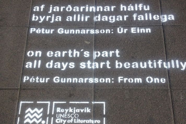 Hressir krakkar úr Vinnuskóla Reykjavíkur vinna í dag að því að mála ljóð á gangstétt á Austurstræti, Laugavegi. Um klukkan ellefuleytið í dag höfðu þau klárað búta úr þremur ljóðum, sem eru skrifuð bæði á íslensku og ensku. Vonast er til þess að textinn haldist á gangstéttinni út sumarið. Það er Höfuðborgarstofa sem stendur fyrir þessum atburði en Vinnuskólinn framkvæmir eins og áður segir.