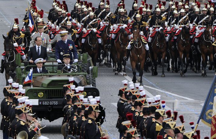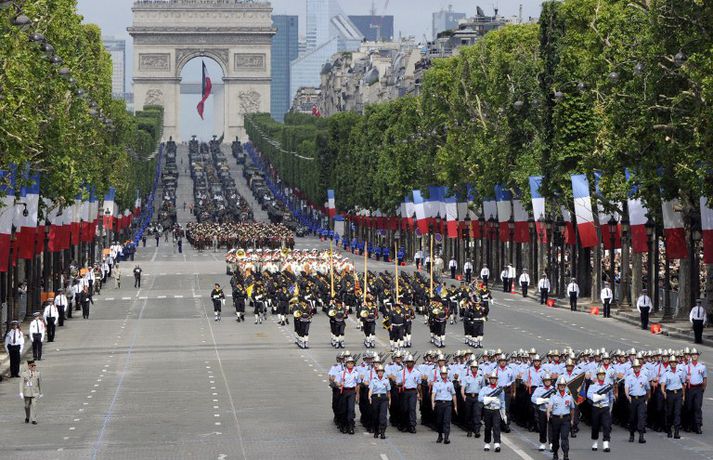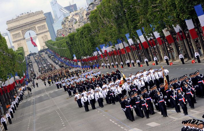 Þjóðhátíðardagur Frakka var haldinn hátíðlegur í dag. Hann nefnist í daglegu tali Bastilludagurinn en þá minnast Frakkar árásarinnar á bastilluna þann 14. júlí árið 1989. Sá atburður markaði upphaf Frönsku byltingarinnar. Það var bókstaflega öllu til tjaldað á Champs-Élysées í París í dag þegar hver herfylkingin á fætur annarri marseraði niður strætið í marglitum búningum. Herskrúðgangan er stærsta og elsta reglulega herskrúðganga sem haldin er í heiminum í dag. Frakklandsforseti Francois Hollande tók þátt í hátíðarhöldunum, veifaði mikið og kyssti börn.