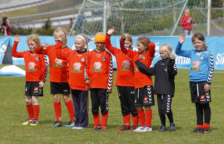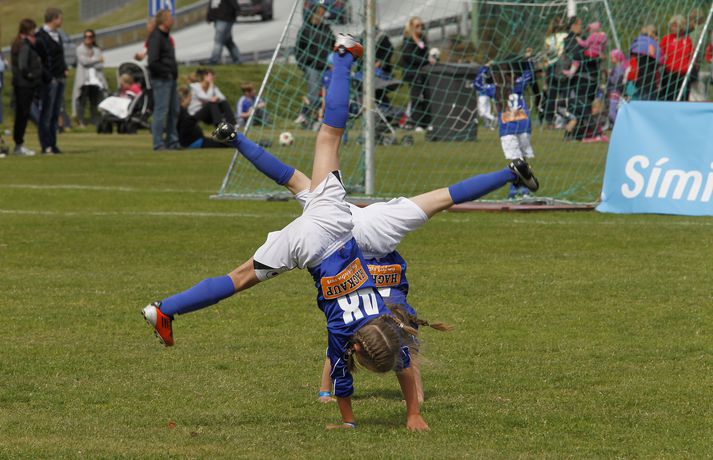 Um helgina reimar yngsta kynslóð knattspyrnukvenna á sig takkaskóna og reynir mátt sinn og meginn á fótboltavellinum. Símamótið fer fram í Kópavogi en þar etja 5., 6. og 7. flokkur kvenna kappi. Mótið hófst með skrúðgöngu á fimmtudag en keppni hófst í gær. Mótsslit verða síðdegis á morgun. Leikirnir fara fram á völlum á félagssvæði Breiðabliks. Veðrið lék við stúlkurnar í gær þegar ljósmyndarinn Pjetur leit við á svæðinu og myndaði stemninguna.Mynd/Pjetur