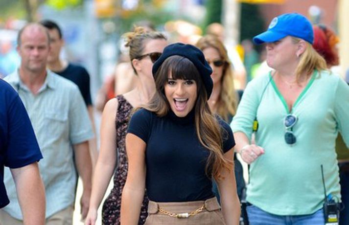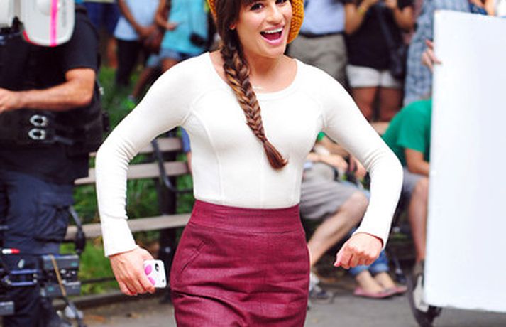 Tökur á nýrri þáttaröð af ofur vinsælu sjónvarpsþáttunum, Glee standa nú yfir í New York. Fylgjast fjölmiðlar vestan hafs sem og áhorfendur spenntir með á tökustað en það var stjarna þáttanna Lea Michele sem allra augu beindust að í vikunni þegar hún lék röð atriða, söng og skipti ört um föt. Fjölmiðlar vilja meina að nánast allt sem þessi unga stjarna klæðist komist í tísku. Má því gera ráð fyrir að þvertoppur, stutt pils og uppháir sokkar verði málið í vetur. Sjá má Michele í meðfylgjandi myndasafni.