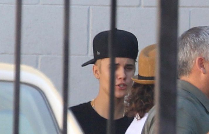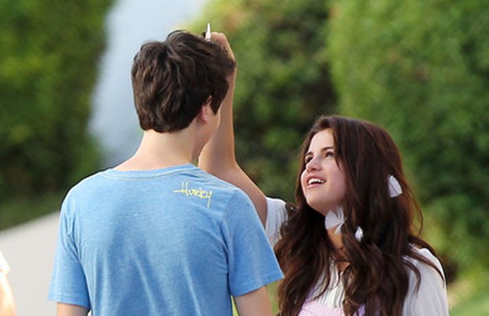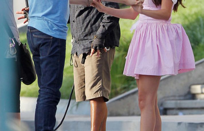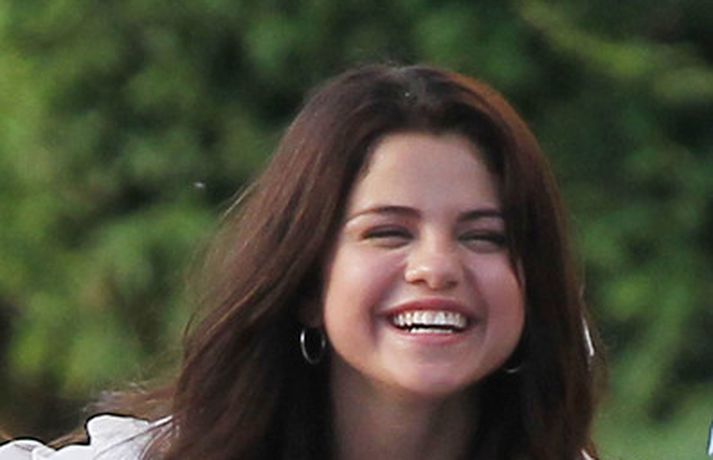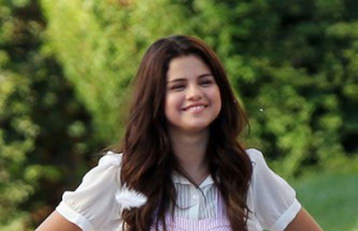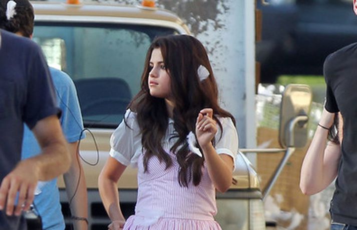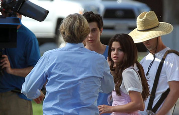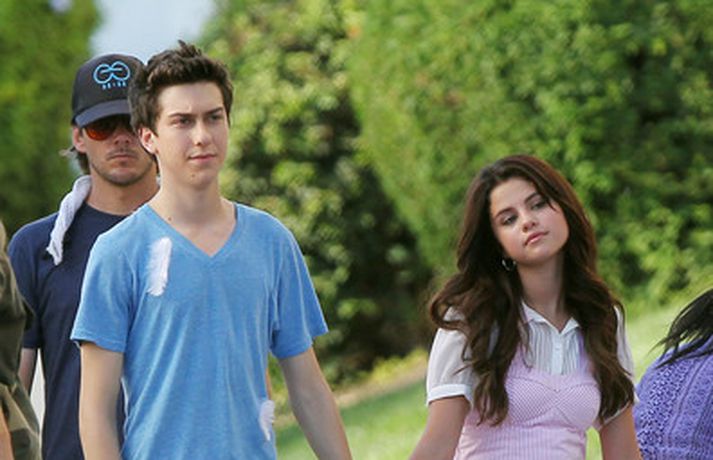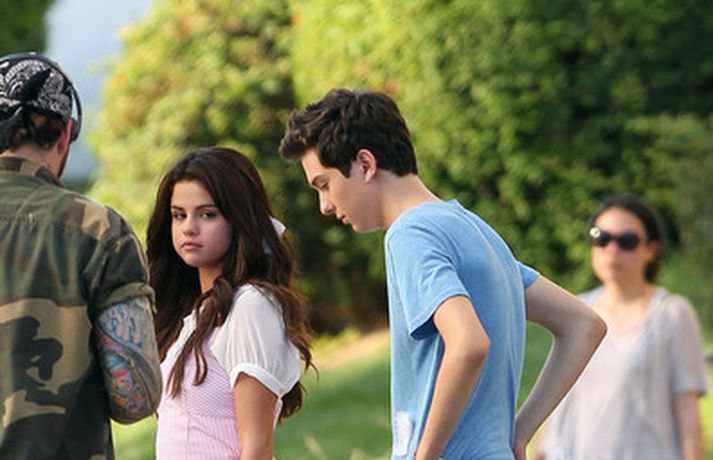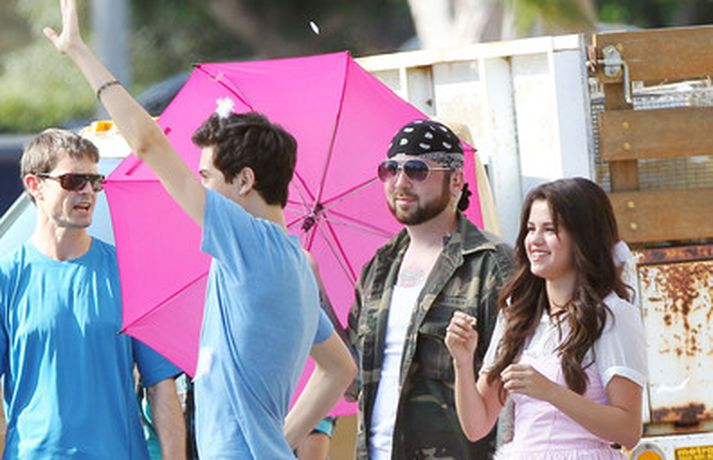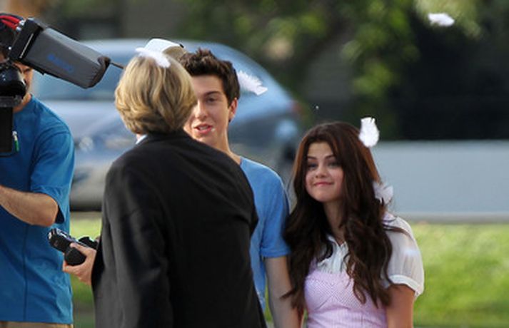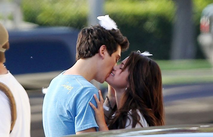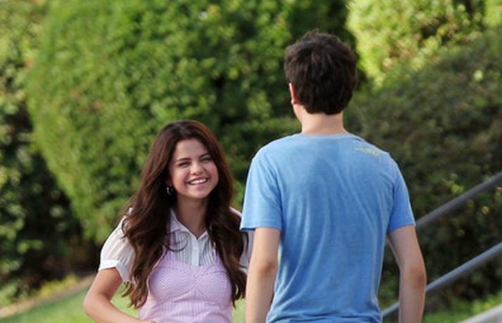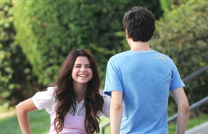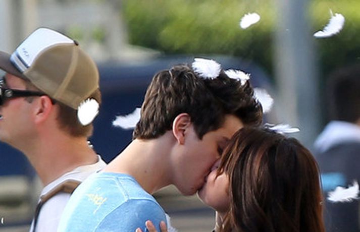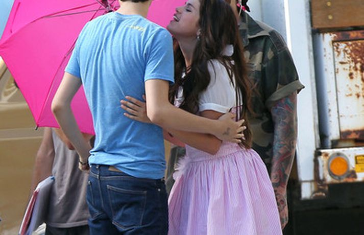 Selena Gomez, 20 ára, var klædd í fallegan bleikan kjól þegar hún smellti rembingskossi á Nat Wolff, 17 ára, í Kaliforníu. Um var að ræða tökur á rómantískri kvikmynd en Selena og mótleikari hennar og hún náðu vel saman á milli kossanna og hlógu og skemmtu sér eins og sjá má ef myndasafnið er skoðað. Poppstjarnan Justin Bieber, kærasti Selenu, var ekki langt frá. Hann mætti á tökustaðinn til að fylgjast með stelpunni sinni - nema hvað.