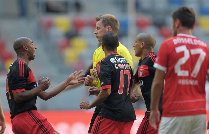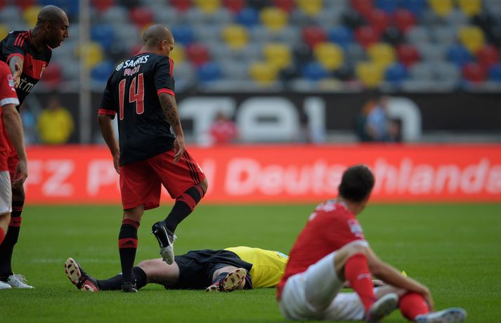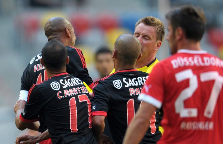 Brasilíski varnarmaðurinn Luisao sem spilar með Benfica var ekki ánægður með ákvörðun dómarans í æfingarleik Benfica og Fortuna Dusseldorf í dag. Dæmt var brot á liðsfélaga hans og tók hann illa í það líkt og sést á myndbandinu hér fyrir ofan. Hann kom á ferðinni og skallaði dómarinna sem steinlá. Luisao hefur spilað 208 leiki fyrir Benfica og 43 leiki fyrir Brasilíska landsliðið.
