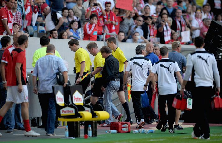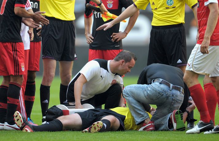 Luisao rotaði dómara í æfingarleik 12. ágúst 2012 23:45 Brasilíski varnarmaðurinn Luisao sem spilar með Benfica var ekki ánægður með ákvörðun dómarans í æfingarleik Benfica og Fortuna Dusseldorf í dag. Dæmt var brot á liðsfélaga hans og tók hann illa í það líkt og sést á myndbandinu hér fyrir ofan. Hann kom á ferðinni og skallaði dómarinna sem steinlá. Luisao hefur spilað 208 leiki fyrir Benfica og 43 leiki fyrir Brasilíska landsliðið. Fótbolti Mest lesið Uppgjörið: Þýskaland - Ísland 42-31 | Þrot í Þýskalandi Handbolti Líður alltaf yfir hana þegar hún kemur í mark Sport „Hefði séð eftir því alla ævi“ Íslenski boltinn Scholes hættir og setur einhverfan son sinn í fyrsta sætið Enski boltinn KR - ÍA 109-75 | KR-ingar sýndu allar sínar bestu hliðar þegar þeir burstuðu Skagamenn Körfubolti „Mjög sáttur með samninginn“ Íslenski boltinn „Hann ætti bara að skrifa afsökunarbiblíuna“ Körfubolti Uppgjörið: Valur - Grindavík 55-90 | Taplausir Grindvíkingar kjöldrógu Val Körfubolti Rekinn fyrir ummæli sín um krabbameinssjúka handboltagoðsögn Handbolti Uppgjörið: Álftanes-Njarðvík 93-92 | Heitur Haukur var hetjan á Álftanesinu Körfubolti Fleiri fréttir Juventus ræður Spalletti út tímabilið Meistaradeildin skiptir um bjór og Heineken snýr sér að padel Aron Einar kominn á toppinn Tölur úr Bestu: Hallgrímur Mar bjó til langflest færi Fantasýn: „Þessi vörn er eitthvað skrímsli“ Scholes hættir og setur einhverfan son sinn í fyrsta sætið Rúmar tvær milljónir í boði ef þú finnur hundinn hans Aarons Ramsey Carrick í einkaviðtali: Sigurinn á Anfield stór stund fyrir Man. Utd Hefur spilað 16 mínútur og fengið tvö rauð spjöld Bættu Evrópumet AC Milan liðsins með Gullit og Van Basten innanborðs Slot: Engin auka pressa við þetta tap Real Madrid vill stórar skaðabætur frá UEFA „Mjög sáttur með samninginn“ „Hefði séð eftir því alla ævi“ Magnús Már í viðræðum við HK Bað alla nema þjálfarann afsökunar Vísar slúðrinu til föðurhúsanna Ísak Bergmann lagði upp gegn Bayern „Við tókum bara þá ákvörðun að fara í Svanavatnið“ Albert og Mikael Egill í vondum málum á Ítalíu Palace neitar að sleppa takinu á Liverpool „Eitthvað sem ég mun aldrei gleyma“ Einkunnir Íslands: Þrjár heitastar í frostinu Viktor Bjarki skoraði og lagði upp í fyrsta byrjunarliðsleiknum Uppgjörið: Ísland - Norður-Írland 3-0 | Áfram hluti af elítunni Pedri gæti verið frá keppni til langs tíma Arteta fyrstur stjóranna á fætur Þorsteinn breytir engu á milli leikja Snjóbræðslukerfi Þróttar kom KSÍ til bjargar Tölur úr Bestu 2025: Klúðraði langflestum dauðafærum í sumar Sjá meira