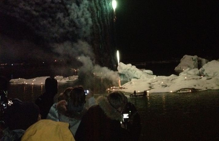 Um 1500 manns komu saman við Jökulsárlón í gær og fylgdust með flugeldasýningu Björgunarfélags Hornafjarðar yfir lóninu. Auk þess fylgdist talsverður fjöldi fólks með henni í beinni útsendingu á vefmyndavél Mílu. Sýningin stóð í um fjörutíu mínútur. Sigríður Dögg Guðmundsdóttir, framkvæmdastjóri Ríkis Vatnajökuls, segir að upplifunin hafi verið engu lík. Bæði gefi umhverfið sýningunni töfrandi blæ auk þess sem hún sé óvenju vegleg og vari lengi. Sýningin var þáttur í fjáröflun Björgunarfélags Hornafjarðar. Hver gestur greiddi þúsund krónur í aðgang. Þar sem gestirnir voru 1500 má gera ráð fyrir að sýningin hafi skilað drjúgum tekjum.