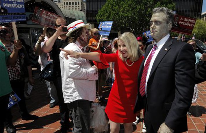 Uppvakningur mun tilkynna um framboð sitt til embættis forseta Bandaríkjanna á næstu dögum. Hræið, sem kallar sig A. Zombie, mun ferðast um landið á næstu dögum ásamt mennskri konu sinni. Framboðið mun vafalaust lífga upp á kosningabaráttuna í Bandaríkjunum. A. Zombie og eiginkona hans, Patty Morgan-Zombie, munu heimsækja sex borgir á næstu dögum en framboðið verður formlega kynnt í San Diego í næstu viku. Hjónin munu einnig heimsækja flokksþing Demókrata og Repúblikana í Charlotte og Tampa. Kosningaloforð A. Zombie þykja afar einföld. Aðspurður um skoðanir sínar á umhverfisvernd sagði hann aðeins fjögur orð: minnka, endurnýta, endurvinna, endurholga. „Eiginmaður minn hefur helgað líf sitt, og framhaldslífi, baráttunni fyrir réttindum uppvakninga og áhorfenda," sagði Morgan-Zombie í samtali við Reuters fréttastofuna. „Hann mun berjast fyrir því að koma uppvakningum á öll heimili í Bandaríkjunum — jafnvel þó að það drepi hann aftur." Margir hafa þó haft orð á því að A. Zombie sigli undir fölsku flaggi. Líklegt þykir að framboðið sé í raun slunginn auglýsingaherferð fyrir nýjustu þáttaröðina af The Walking Dead sem tekin verður til sýninga seinna á þessu ári.