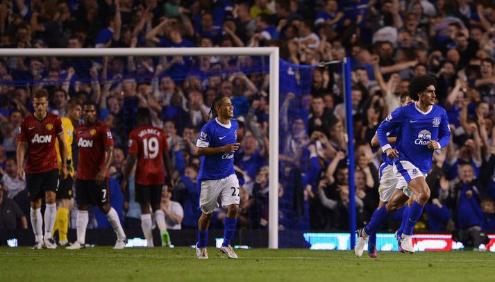 Fyrsta sinn í 20 ár sem Liverpool og Man. United byrja bæði á tapi Óskar Ófeigur Jónsson skrifar 21. ágúst 2012 06:00 Marouane Fellaini fagnar sigurmarki sínu í gær. Mynd/NordicPhotos/Getty Liverpool og Manchester United eru bæði stigalaust eftir fyrstu umferð ensku úrvalsdeildarinnar og sitja í 16. og 18. sæti hennar. Þetta er í fyrsta sinn síðan tímabilið 1992-93 þar sem þessir erkifjendur tapa báðir í fyrstu umferðinni. Manchester United tapaði 0-1 fyrir Everton á Goodison Park í gærkvöldi og Liverpool steinlá 0-3 á móti West Brom á útivelli á laugardaginn. Fyrir tuttugu árum tapaði Liverpool 0-1 fyrir Nottingham Forrest í fyrstu umferð tímabilsins og það var Teddy Sherringham sem skoraði eina mark leiksins. Manchester United tapaði aftur á móti 1-2 fyrir Sheffield United í fyrstu umferðinni 1992-93. Manchester United tapaði reyndar tveimur fyrstu leikjum tímabilsins en tókst engu að síður að tryggja sér sinn fyrsta meistaratitil í 26 ár. Mest lesið Viðurkenna að VAR hafi bilað Fótbolti Arnar Daði rekinn frá Stjörnunni en áfram þjálfari kvennaliðsins Handbolti Jólagjöf í Keflavík: Remy Martin snýr aftur Körfubolti Koepka fyrsta stjarnan sem riftir samningi við LIV Golf Úr Bestu heim í Hauka Íslenski boltinn Þessi tíu eru tilnefnd sem Íþróttamaður ársins 2025: 23 ára aldursmunur Sport Stefndi á ÓL en fannst látinn á hótelherbergi Sport Ótrúlegur sigur á HM: „Ég er mjög tregur svo pressan nær ekki til mín“ Sport Heyrði hvorki frá Blikum né Víkingum Íslenski boltinn Ekkert spilað í vetur en gæti mætt Íslandi í fyrsta leik á EM Handbolti Fleiri fréttir Stewart, Snoop og Modric í eina sæng Vill ekki segja hversu lengi Bruno er frá Spyr hvort Guardiola stígi á vigtina Arsenal í undanúrslit eftir vító Man. Utd reyndi stíft en Semenyo kaus City „Tölfræðilega séð eiga þeir ekkert að vera í þessari stöðu“ Chelsea setur sig í samband við Semenyo Jiménez jafnaði bestu vítaskyttu sögunnar Slot mun sakna Isak í tvo mánuði eftir „glórulausa tæklingu“ Sjáðu „auma“ vítið sem skilaði Fulham sigri Fulham skildi Forest eftir við fallsvæðið Áfallið staðreynd og Isak búinn í aðgerð Fagnaði titli Liverpool sem óður maður um alla borg „Allir virðast elska hann“ „Þetta mun ekki buga okkur“ Guardiola mun vigta leikmenn Man City eftir jólin „Ef þið væruð Antoine Semenyo, hvert mynduð þið fara?“ Sjáðu mörkin: Rogers sá um Manchester United Óttast að Isak hafi fótbrotnað Tvenna frá Rogers tryggði Villa sigur gegn Manchester United Fimmta sinn sem Arsenal er á toppnum um jólin: Unnu ekki titilinn í fyrstu fjögur skiptin „Viljum við að okkar verði minnst fyrir að vera skræfur?“ „Ef dómarinn hefði sinnt sínu starfi almennilega hefði Romero ekki fengið spjald“ Haaland gaf barnabarni Hareide gjöf Sjáðu mörkin úr enska: Sviptingar, sænskt þema og svakalegar tæklingar Calvert-Lewin hættir ekki að skora Gyökeres skaut Arsenal aftur á toppinn Slot fámáll um stöðuna á Isak Gleði og sorg í sigri Liverpool Dramatík er Broja reyndist hetja Burnley Sjá meira