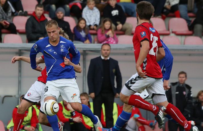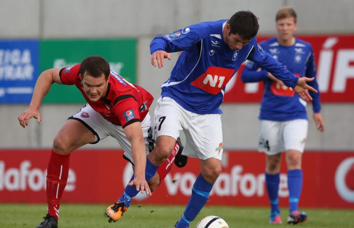 Stjarnan vann frábæran sigur, 2-0, á Val að Hlíðarenda í kvöld en bæði mörk liðsins komu í fyrri hálfleik. Liðið komst því í þriðja sætið og skaust upp fyrir ÍBV og ÍA en Stjarnan er sem stendur með 29 stig, aðeins tveimur stigum á eftir KR. Valsmenn byrjuðu leikinn betur og fengu nokkur ákjósanleg færi fyrstu tuttugu mínútur leiksins en náði ekki að koma boltanum í netið en Ingvar Jónsson, markvörður Stjörnunnar, varði eins og skepna í leiknum og Valsmenn komust einfaldlega ekki framhjá Ingvari. Það var síðan Gunnar Örn Jónsson sem gerði fyrsta mark Stjörnunnar eftir 25 mínútna leik þegar hann stýrði boltanum laglega framhjá Sindra Snæ í marki Vals eftir sendingu frá Alexander Scholz. Rétt fyrir lok fyrri hálfleiksins átti Atli Jóhannsson magnaða stungusendingu inn fyrir vörn Valsmann á Kennie Knak Chopart sem afgreiddi boltann snyrtilega í netið. Valsmenn reyndu hvað þeir gátu í síðari hálfleiknum en allt kom fyrir ekki og þeir náðu ekki að setja mark sitt á leikinn. Niðurstaðan því 2-0 sigur Stjörnunnar sem halda áfram að ná í stig á útivelli. Valur heldur aftur á móti áfram að vera óstöðugt lið sem á í erfileikum með að vinna tvo leiki í röð. Ingvar Jónsson: Þetta var minn besti leikur í sumar„Það var gríðarlega mikilvægt að halda markinu hreinu í kvöld," sagði Ingvar Jónsson, markvörður Stjörnunnar, eftir sigurinn í kvöld. „Það var einnig mjög mikilvægt að ná inn öðru marki rétt fyrir lok fyrri hálfleiksins og fara með væna forystu inn í klefa". „Ég hrök í gang þegar ég lenti í samstuði í byrjun leiksins, þetta var líklega besti leikurinn minn í sumar. Við ætlum okkur að ná í þetta Evrópusæti, það er alveg á hreinu." Hægt er að sjá myndband af viðtalinu hér að ofan. Atli Sveinn: Við nýttum ekki okkar færi á meðan hlutirnir gengu upp hjá þeim„Við höfum alveg spilað verra í sumar en þetta féll bara ekki með okkur í kvöld," sagði Atli Sveinn Þórarinsson, leikmaður Vals, eftir tapið í kvöld. „Ingvar var okkur erfiður í markinu og við áttum erfitt með að komast framhjá honum. Við nýttum ekki okkar færi í leiknum á meðan þeir gerðu hið andstæða, það þýðir ekki að dvelja við það og við þurfum bara að halda áfram." „Þetta er virkilega þéttur pakki í deildinni og við ætlum okkur ennþá að þoka okkur aðeins ofar."Hægt er að sjá myndband af viðtalinu með því að ýta hér.