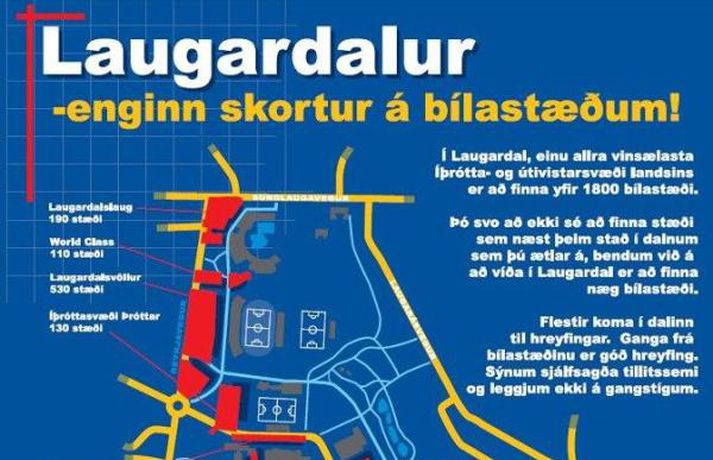Lögreglan á höfuðborgarsvæðinu beinir þeim góðfúslegu tilmælum til ökumanna sem eiga leið um Laugardalinn að nýta þau bílastæði sem þar eru í stað þess að leggja ólöglega á eða við götur á svæðinu. Þetta er nefnt sérstaklega vegna landsleiks Íslendinga og Norðmanna í knattspyrnu sem fram fer á Laugardalsvellinum í kvöld. Í tilkynningu frá lögreglu segir að reynsla síðustu ára sýni að bílastæði við völlinn séu ekki fullnýtt þegar ýmsir stórviðburðir fara þar fram. Þess í stað hafa margir lagt það í vana sinn að leggja ólöglega á Reykjavegi og Engjavegi svo aðeins tvær götur séu nefndar. Sömuleiðis er iðulega lagt ólöglega á ýmis grassvæði í Laugardalnum. Lögreglan ítrekar því tilmæli sín til ökumanna og hvetur þá til að nýta bílastæðin til fulls. Að öðrum kosti mega ökumenn búast við sektum vegna stöðubrota en gjaldið, 5000 kr., rennur í Bílastæðasjóð. Ljóst er að ekki geta allir vallargestir lagt bílum sínum við Laugardalsvöllinn en í nágrenni hans eru víða ágæt bílastæði. Þess má geta að veðurútlitið er gott og því ætti engum að muna um að leggja smáspöl frá leikvanginum og ganga í fáeinar mínútur að vellinum. Hér fyrir ofan má sjá mynd þar sem staðsetning bílastæða eru sýnd.