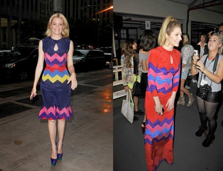 Leikkonan Elizabeth Banks og söngkonan Nicola Roberts eru óhræddar við að klæðast litríkum fötum. Þær fjárfestu báðar í kjólum frá House of Holland sem eru svo sannarlega áberandi. En hvor ber þetta zig zag munstur betur?