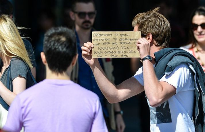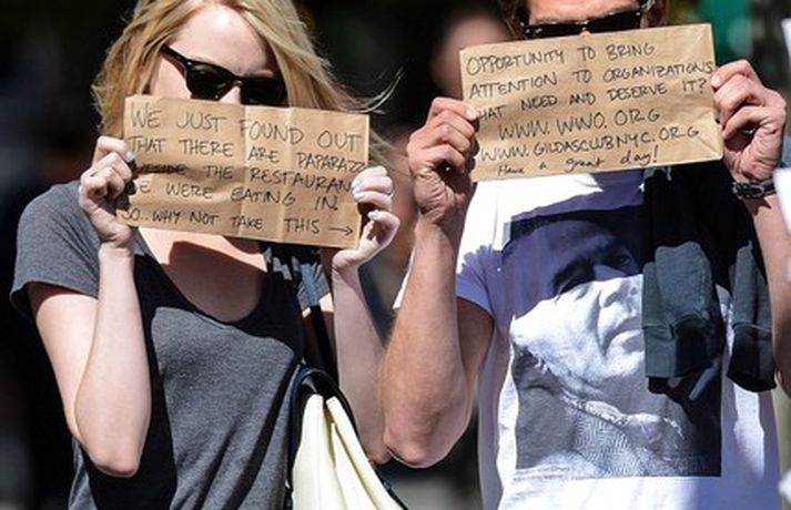 Stjörnuparið Emma Stone og Andrew Garfield kunna svo sannarlega að nýta sér frægð sína – og paparassana. Þau fóru út að borða um helgina á veitingastað í New York og tóku eftir því að það biðu paparassar eftir þeim fyrir utan. Þau ákváðu því að búa til sérstök skilti til að vekja athygli á góðgerðarsamtökum sem þau styðja, Worldwide Orphans Foundation og Gilda's Club New York City. Vonandi bar þetta einhvern árangur en paparassarnir mynduðu parið og skiltin þeirra í bak og fyrir.